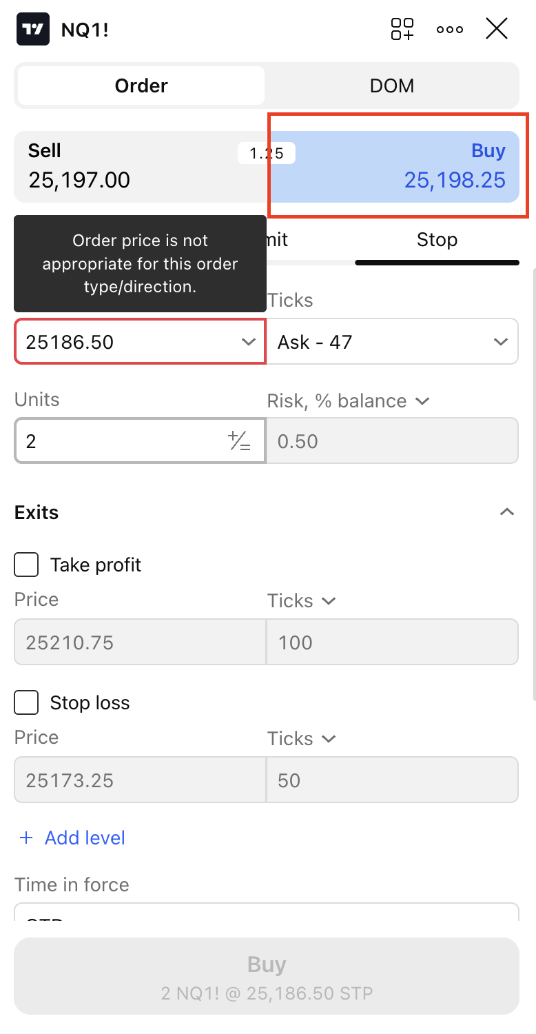 The Order Panel prevents you from placing the Stop Order that will get executed right after the placement at the current market price. Note, that the Stop Order does not guarantee it will be executed at the selected price. It gets triggered when the market price hits the Stop one and gets executed at the next market price.