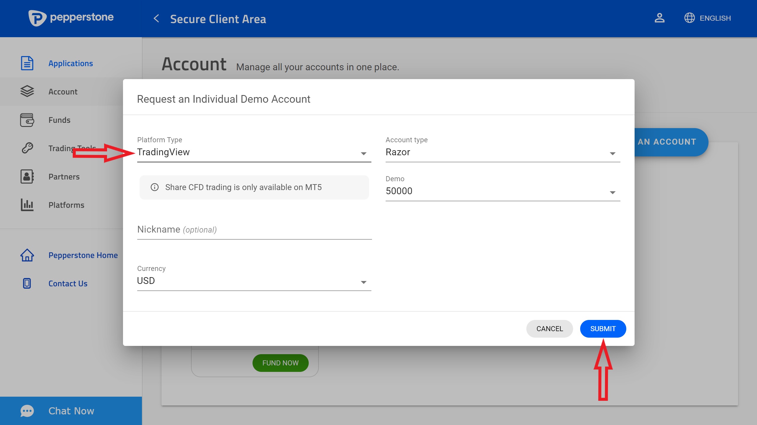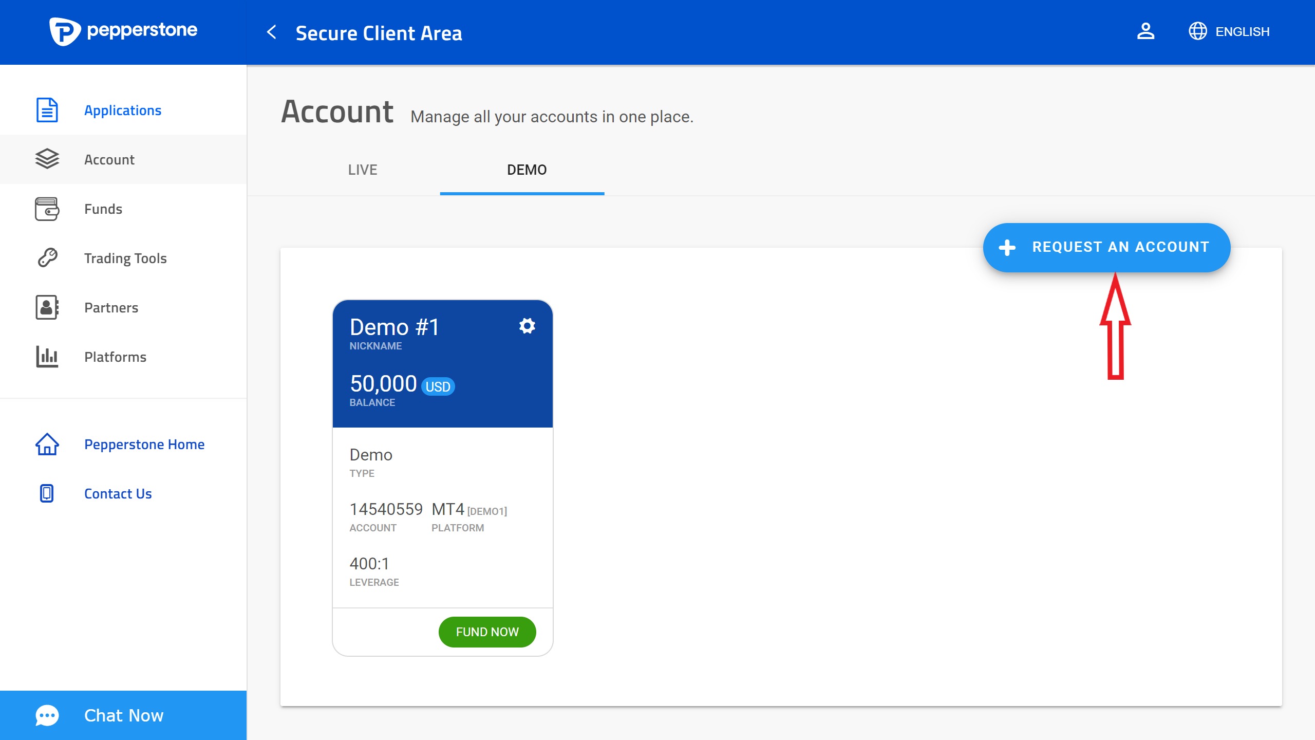 Log in with your username and password on the Pepperstone website. The Secure Client Area section contains accounts with which you can log in on various platforms. If there is no account here with the Nuvexlens value, then click on the Request an account button.