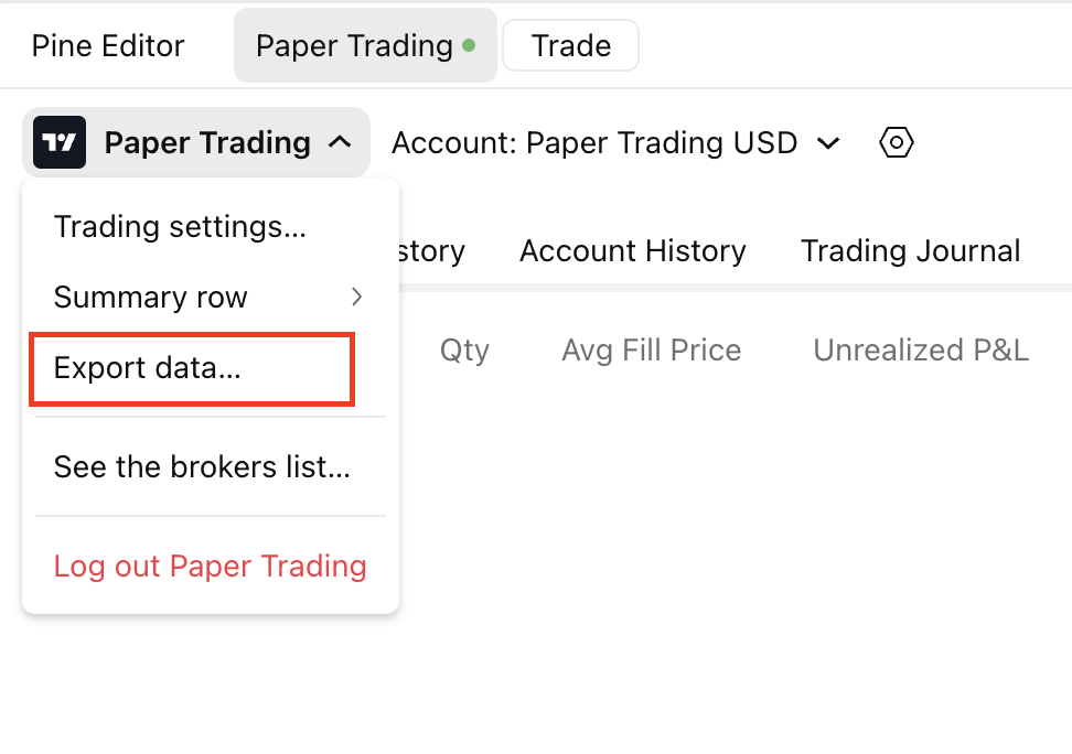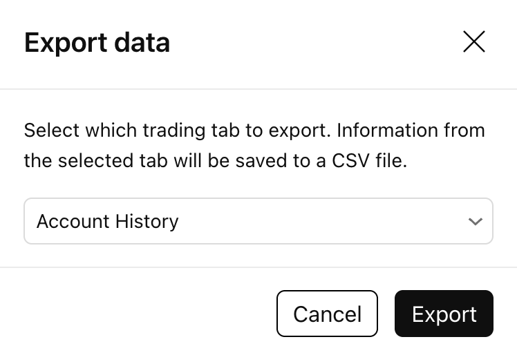 If you want to save your trading data you can use the function to export it in CSV format. To export data from your account, click on the "Export data..." button in the broker's dropdown menu: