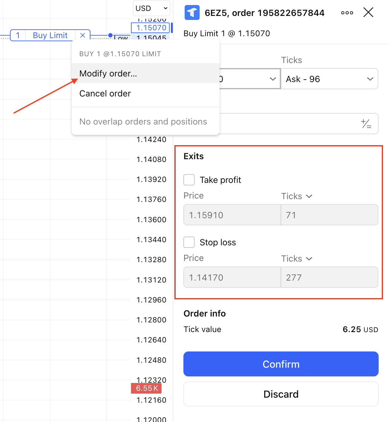 If you right-click and select the option “Modify Order”, both Stop Loss and Take Profit options will be grayed out.