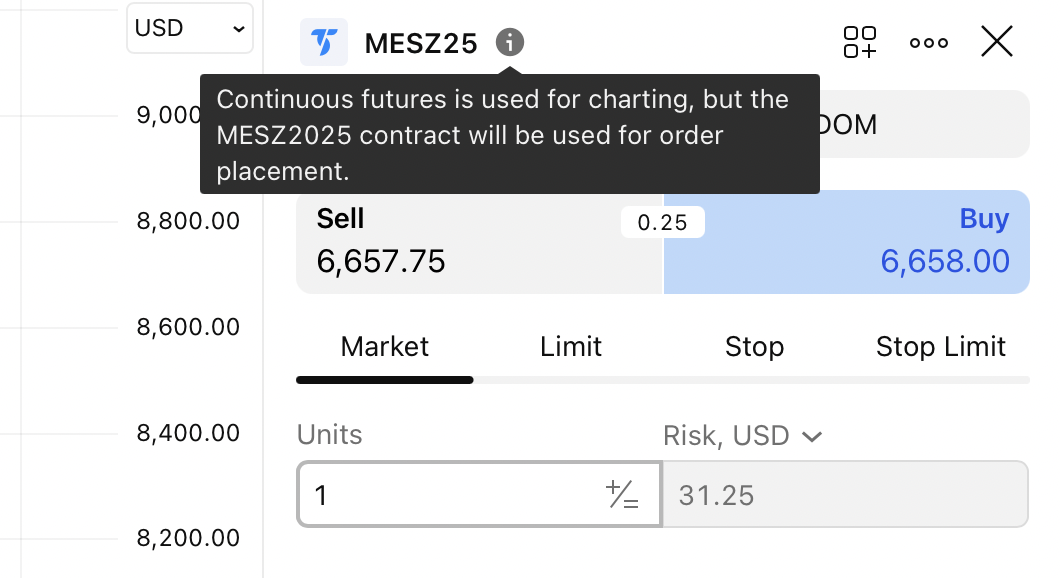 You can trade 1! continuous contracts. However, this applies only to futures from the CME and EUREX exchanges. Placing an order using a 1! continuous contract is enough to select it on the chart and place an order as usual. It is important to understand that the order will be set for the front contract, i.e., for the contract with the nearest expiration month, which is currently included in the 1! contract.