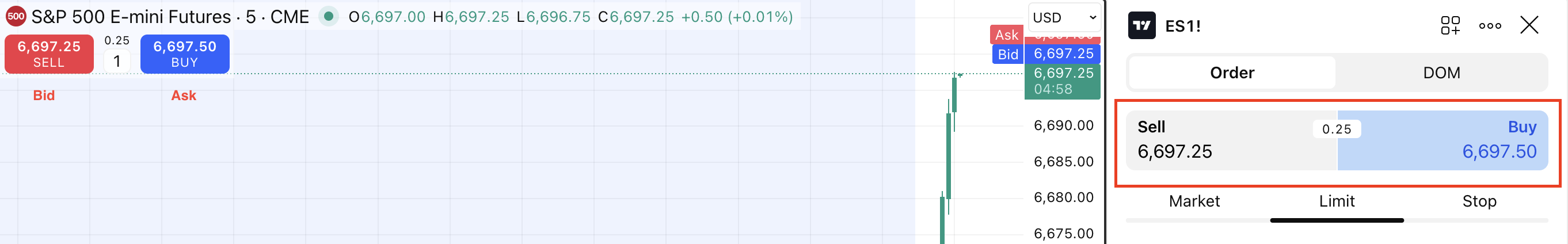 In most cases, buy orders are executed at the ask price, and sell orders at the bid price. The last price on the chart does not affect the calculation. They are displayed in the order panel and on the "Buy" and "Sell" buttons in the top left corner.