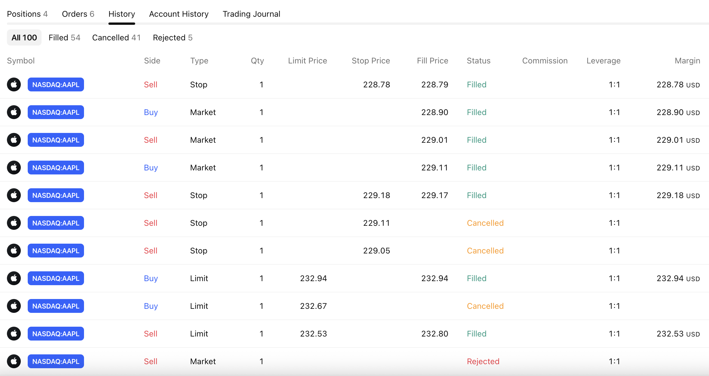 The Order History section keeps track of all your trading activity — placed, filled, canceled, or rejected orders. It provides a detailed timeline of your trading decisions and outcomes, making it essential for reviewing performance or resolving disputes.