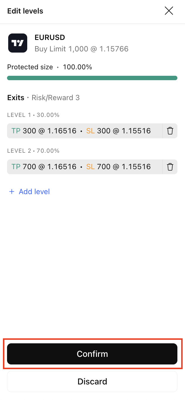 Once you have finished configuring the exit levels, click the confirmation button to save the configuration and return to the order ticket.