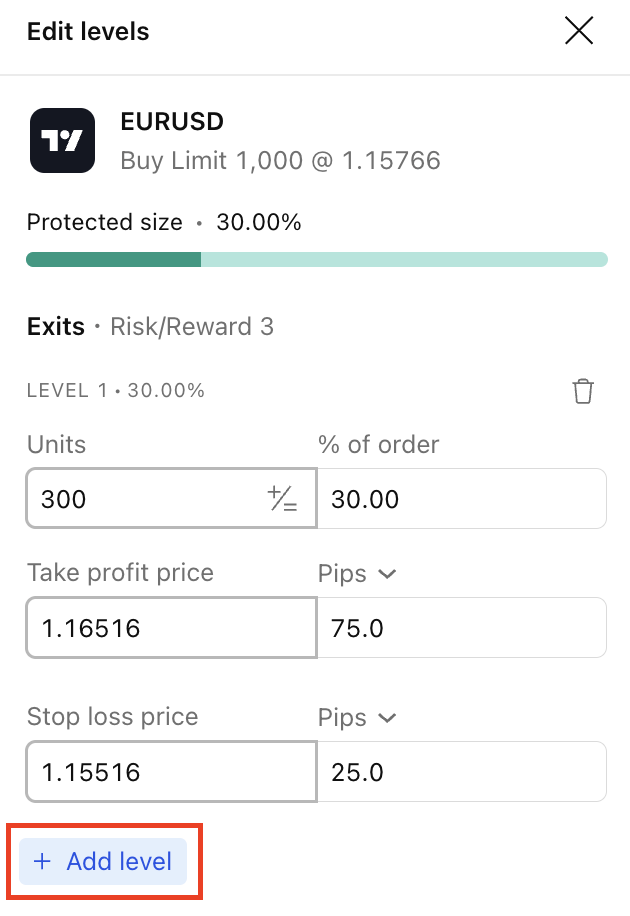In the dialog that opens, set the quantity and price for the Take Profit and Stop Loss. To add another level, click "Add level" within the level configuration dialog. Please note that in Paper Trading, you can add up to 4 exit levels.