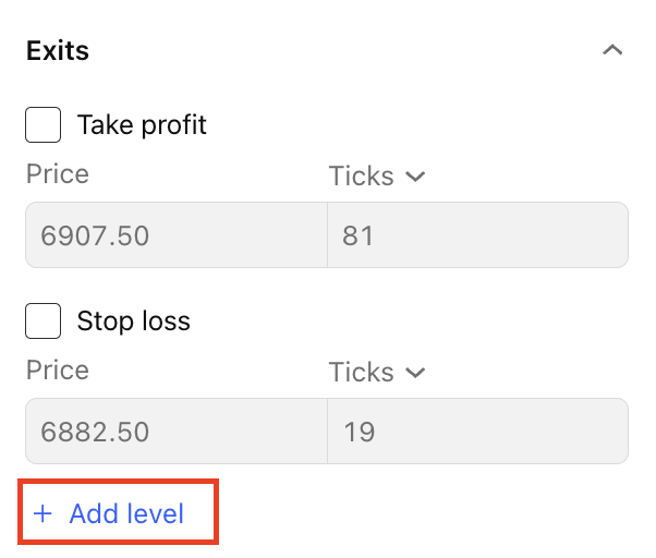 To add multiple exit levels to an order, click the "Add level" button in the Exits section of the order ticket.