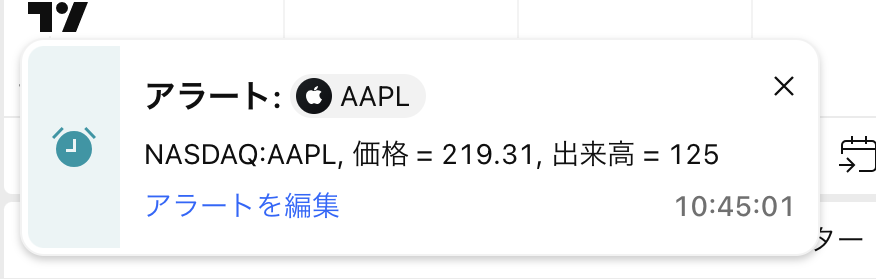 特別なプレースホルダーを利用してアラートメッセージで変数の値を利用することができます。たとえば、NASDAQ:AAPL でアラートを作成してメッセージ欄に以下のように入力するとします: