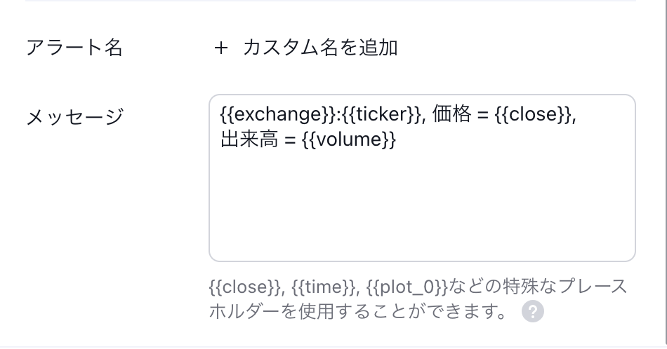プレースホルダーは alertcondition関数の引数であるmessageで指定することもできます。アラートを作成すると、この引数の値が自動的にアラートのテキスト入力ボックスに引用されます。