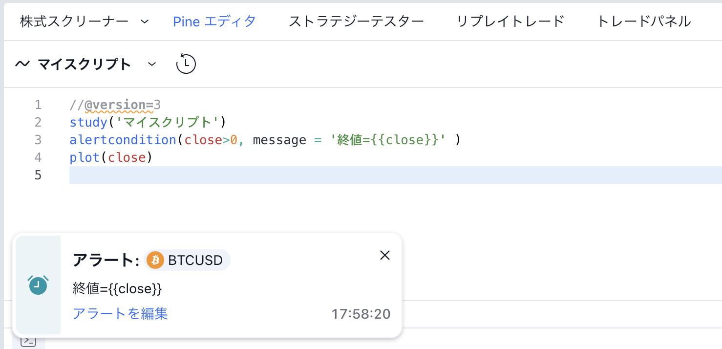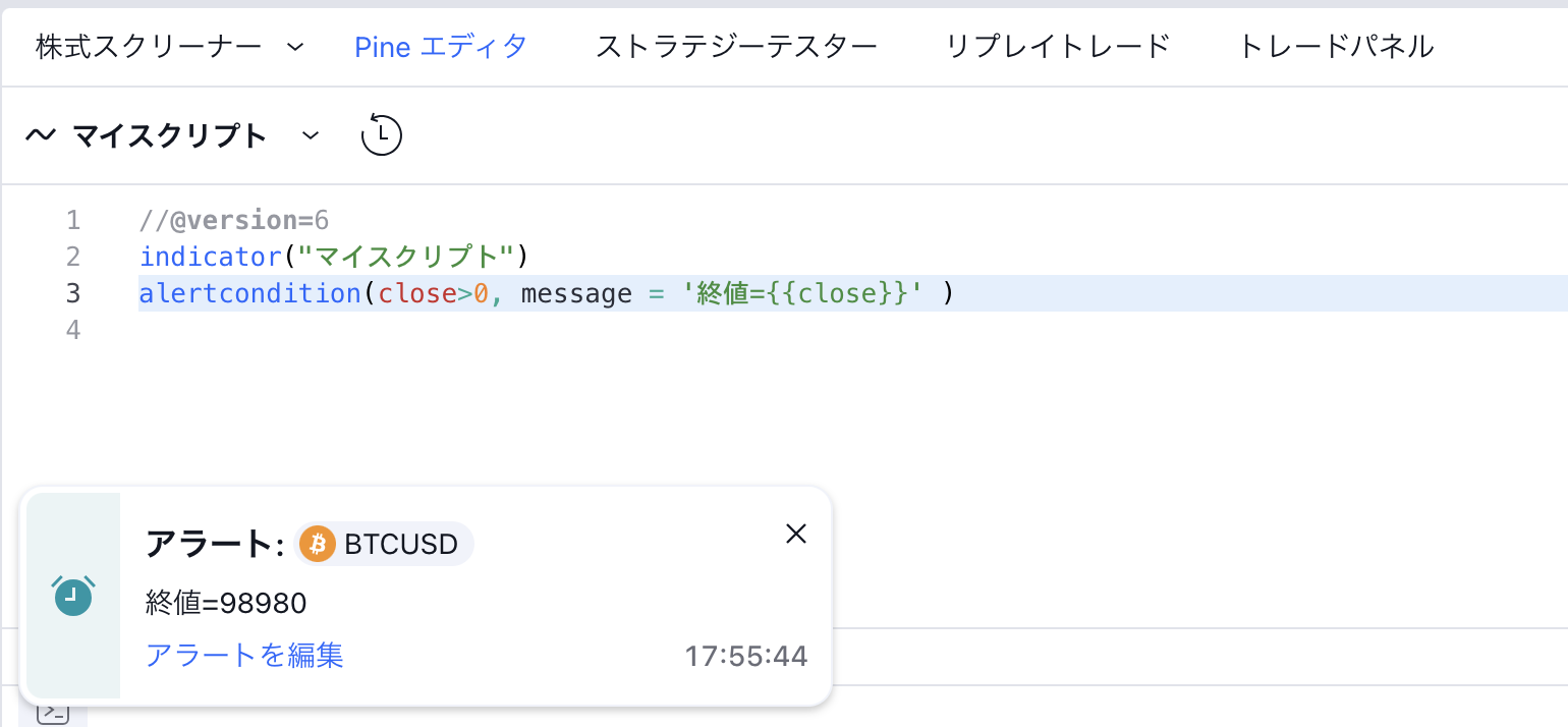 alertcondition()関数の値の置換機能は、Pine v4以降で作成されたスクリプトでのみ機能します。アラートがトリガーされた時にメッセージ欄の変数が値に置き換えられない場合(例えば「Close = 45.1」といった形式ではなく「Close = {{close}}」と変数のまま表示される場合)、そのalertcondition()を利用したインジケーターが以前のバージョンのPineで書かれている為、変数の置換が機能しないと考えられます。