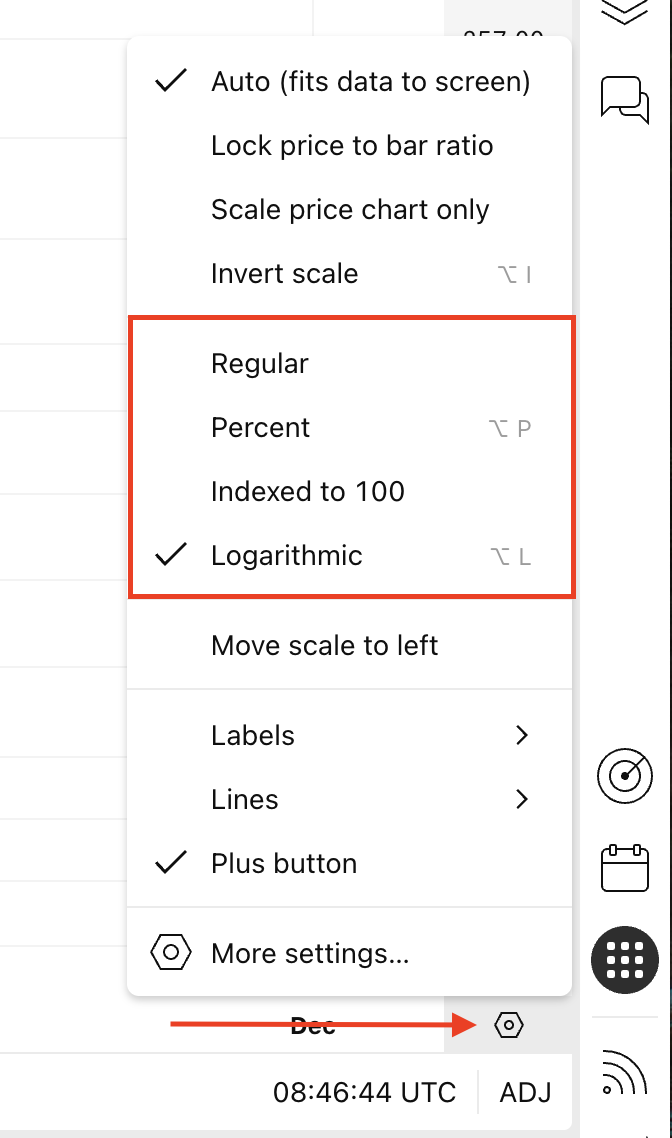 現在のシステムにはログスケール(対数)が実装されていますが、その技術的な特殊性により、ログスケールに基づいたアラートは描画の正確な位置を正確に反映していないことがあり、想定外のトリガー動作を引き起こす可能性があります。対策として、ログスケールから通常スケールへの切り替えをおすすめします。これによりアラートの計算の精度が高まり、より正確なトリガー条件が確保されます。