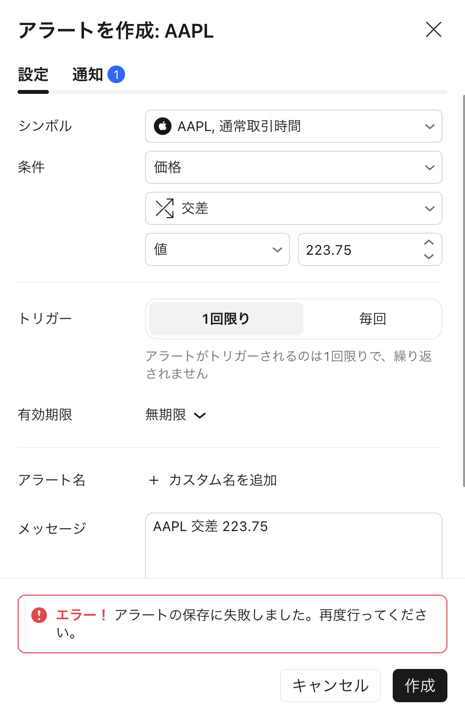 アラート作成/読み込み時のエラー