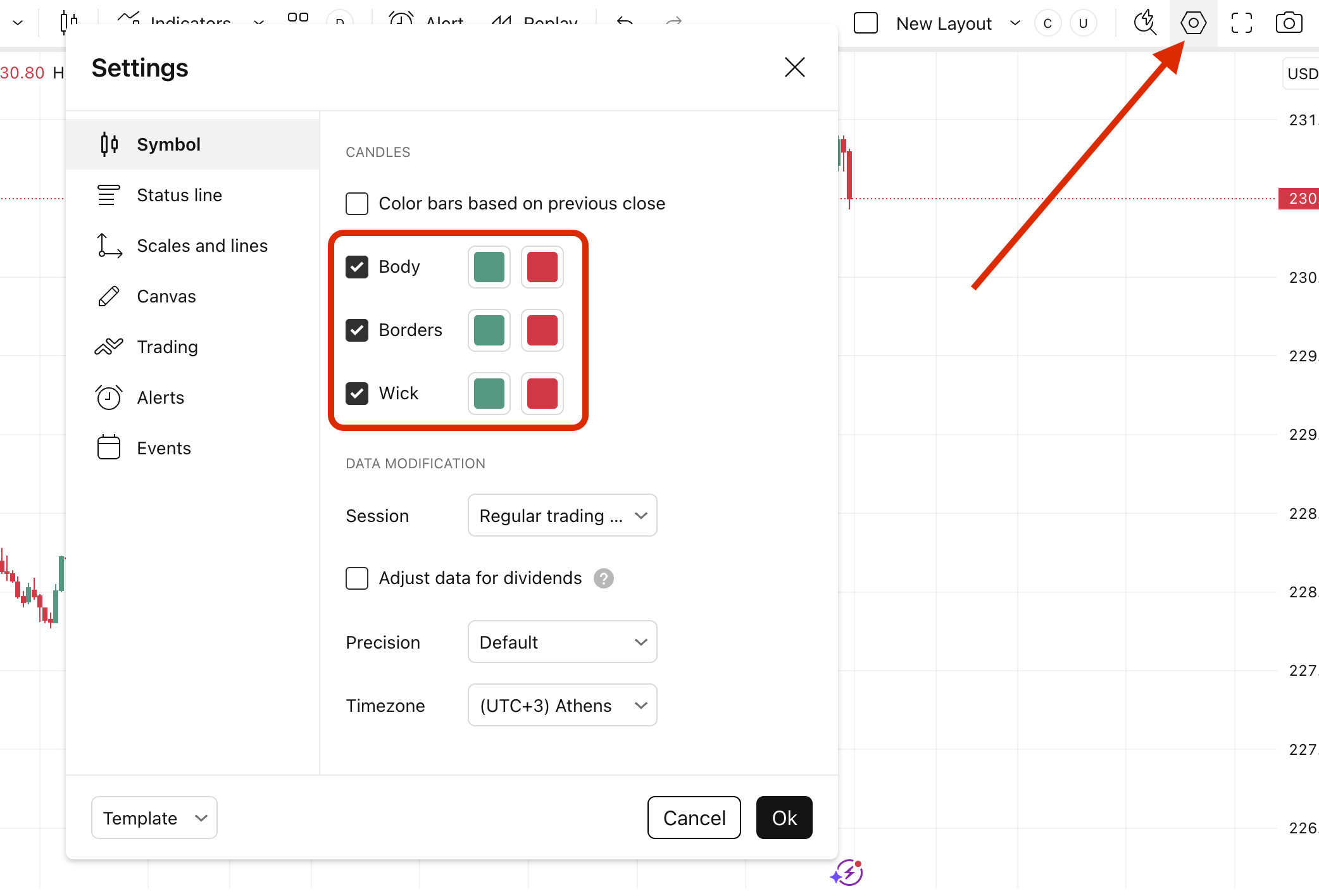 2. チャート設定で "実体"、"枠"、"ヒゲ" のチェックボックスにチェックが付いていることをご確認ください。合わせてそれらの色に背景と同じ色が設定されていないことをご確認ください。