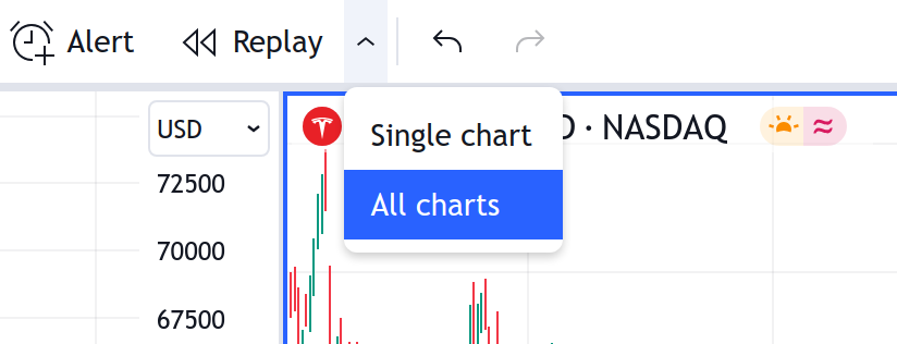 ワークスペースを複数のチャートに切り替えると、リプレイモードを「単一のチャート」と「すべてのチャート」のいずれかから選択できるようになります。
