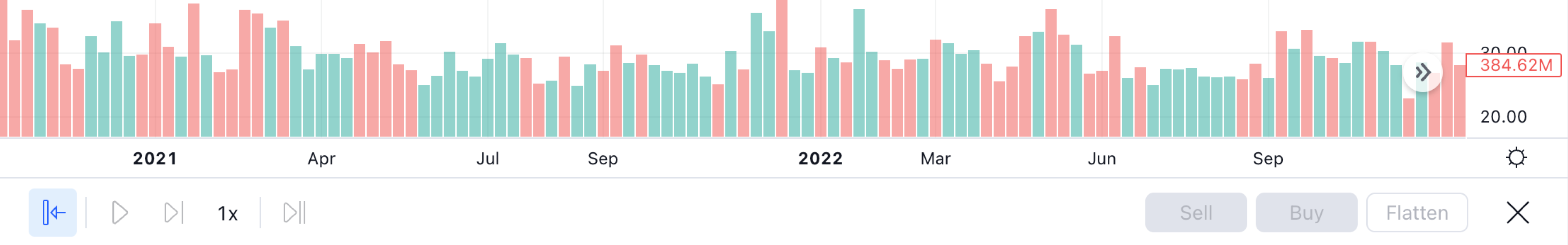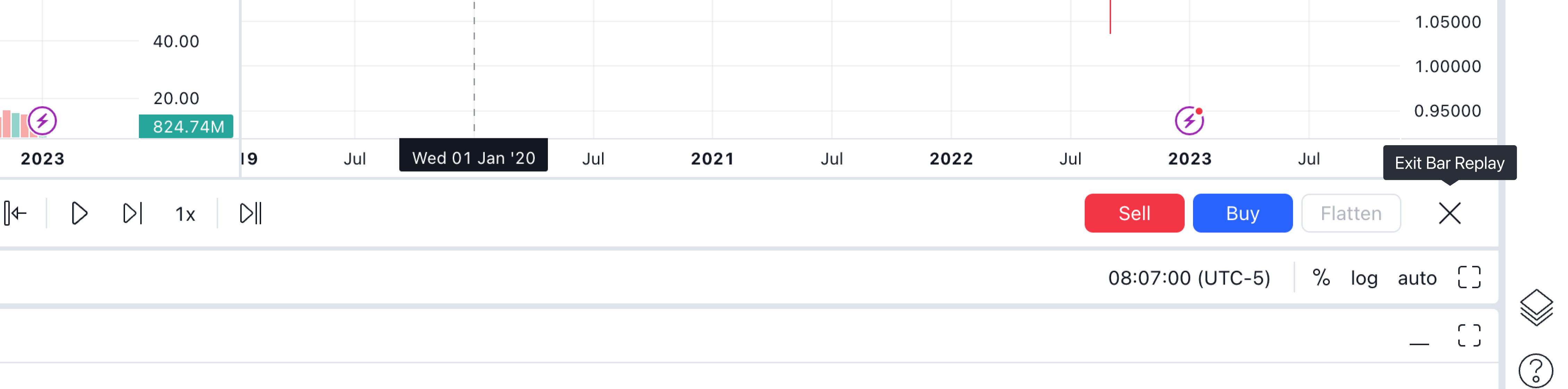 リプレイパネルを閉じるには、「×」印をクリックするか、チャート上部のツールバーにある「リプレイ」ボタンをクリックしてください。
