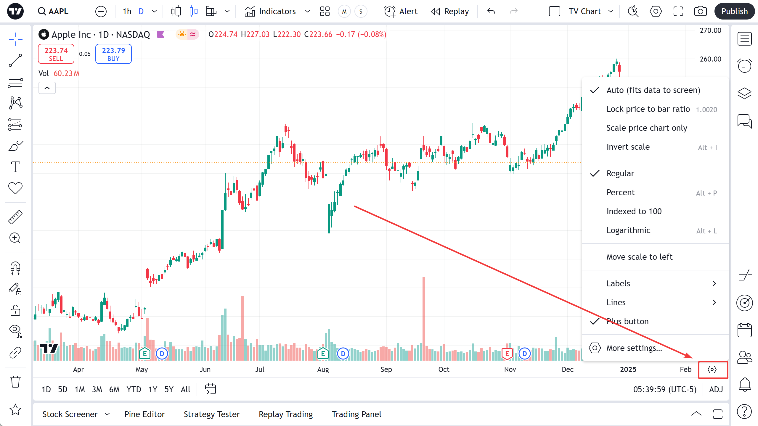 スケール設定のボタンは、価格スケールのすぐ下から利用できるようになりました。