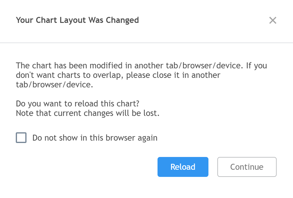 このメッセージは、現在利用中のチャートレイアウトが他の場所で保存された事を意味します。現在のウィンドウで該当のチャートレイアウトの作業を継続することは可能ですが、その場合何か変更を行って保存すると、他のデバイス/他のブラウザ/他のタブで行ったすべての変更が失われます。私たちはこのメッセージをあなたがご自身の作業や分析を失う事が無い様に表示しています。