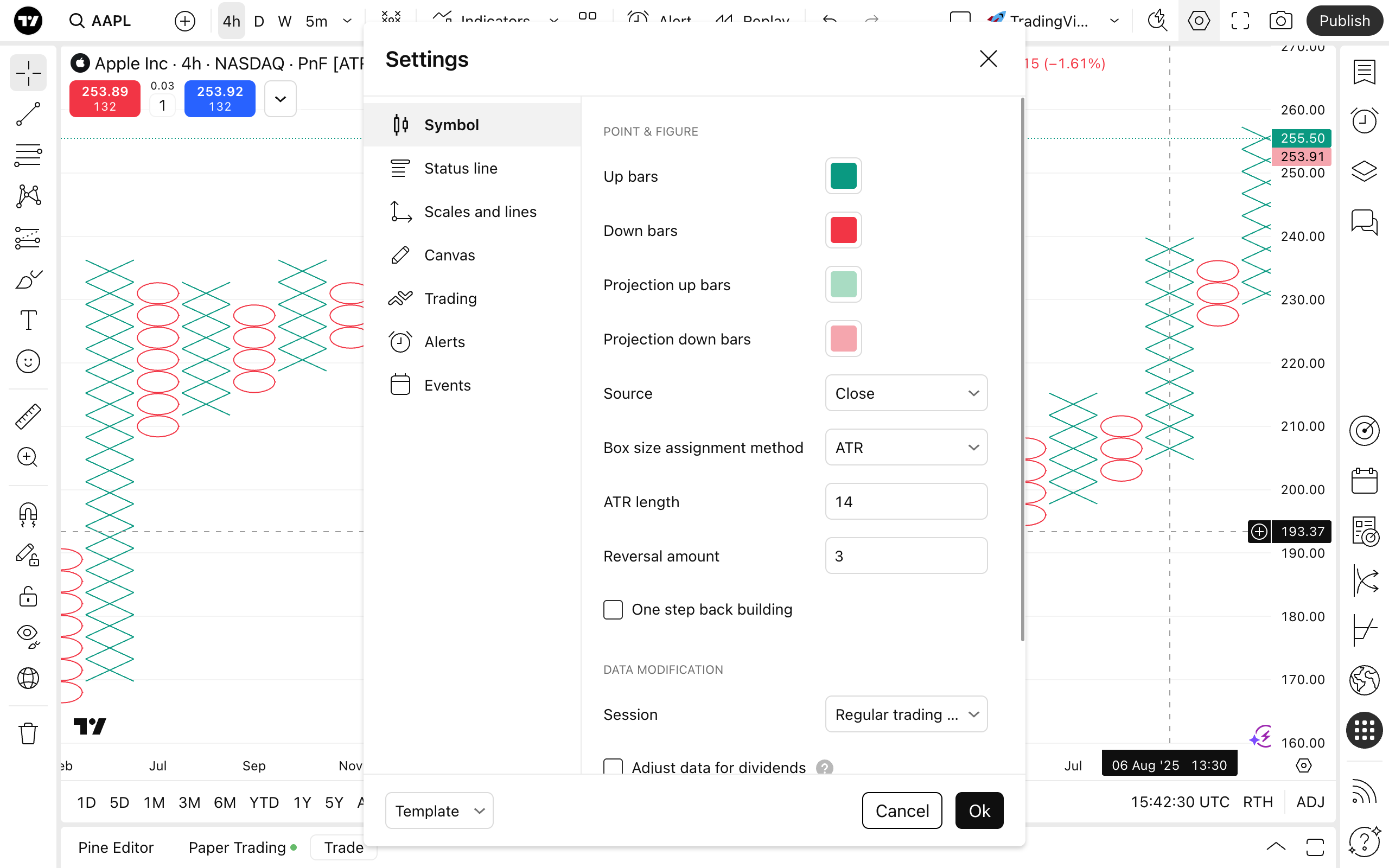 - ATRの期間: ボックスサイズの計算方法としてATRを選択した場合にATRの期間を設定します。デフォルトは14です。