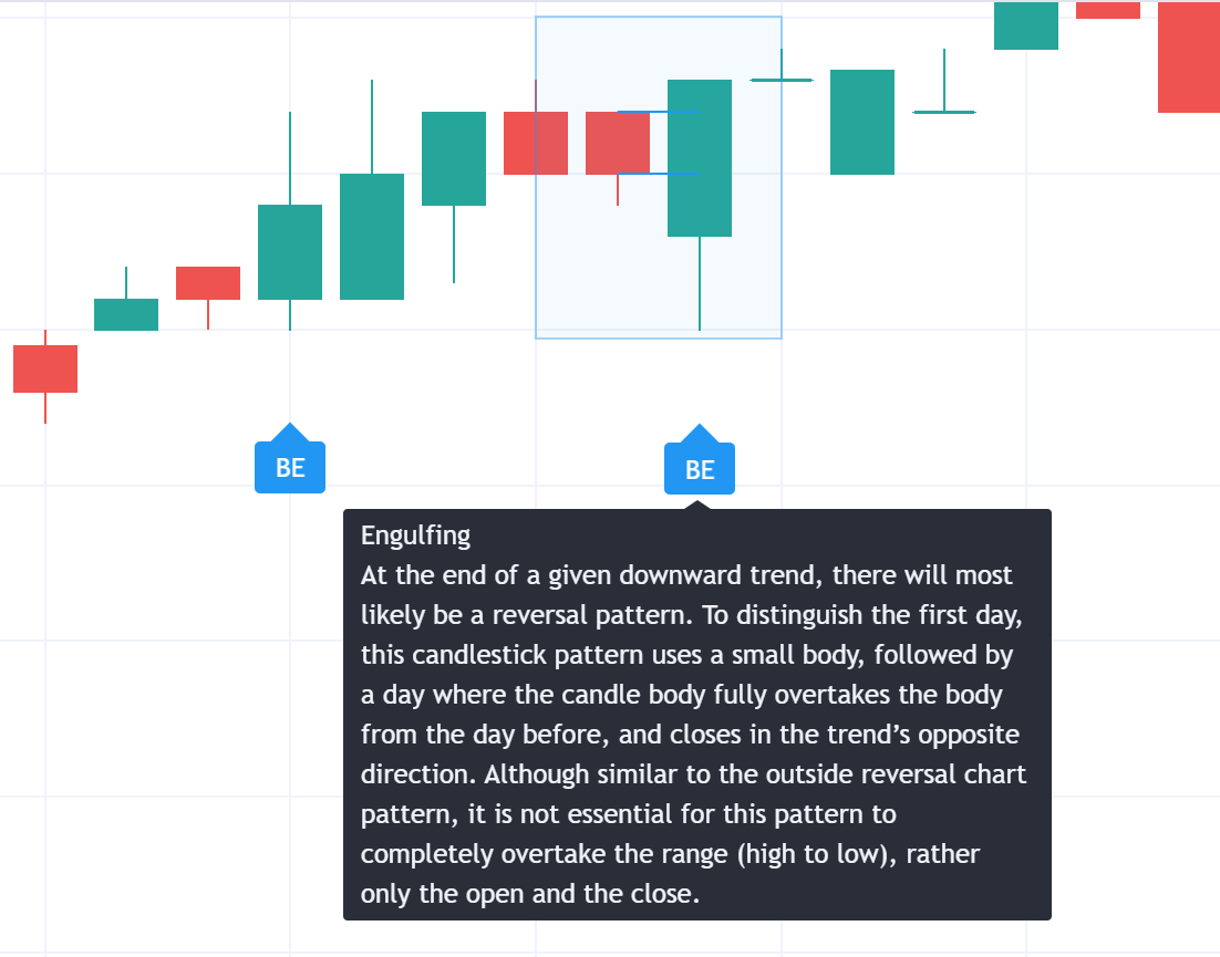 強気の包み線は、2本のローソク足で構成される反転パターンで、通常は下降トレンドの終わりに見られます。このパターンでは、初日のローソク足は小さな実体です。翌日は前日のローソク足を完全に下回ったあとに、トレンドと逆向きに引けます。アウトサイドリバーサルに似ていますが、レンジ (高値から安値) 全体を包まなくてもよく、始値と終値を包むことだけが必要とされています。