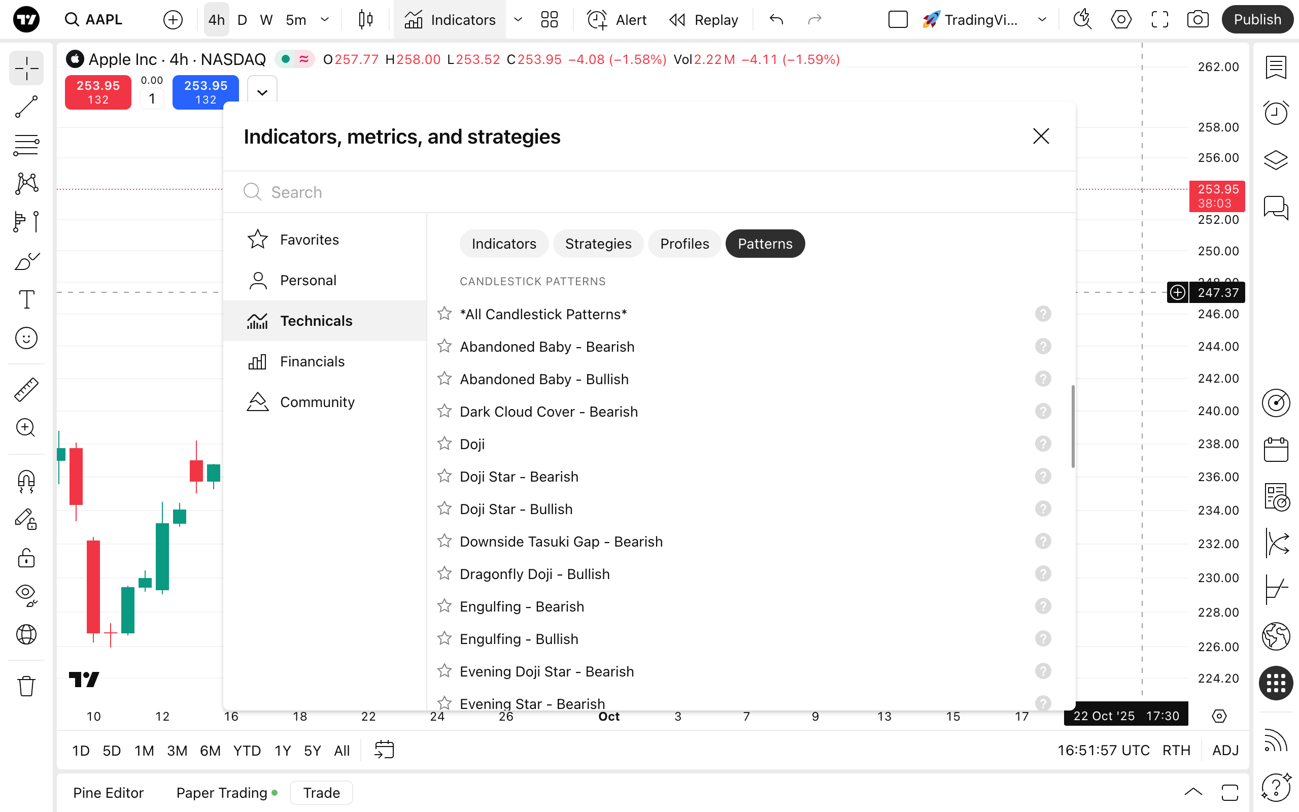 ローソク足パターン・インジケーターをスーパーチャートに追加するには、"インジケーター、指標、ストラテジー" 検索のダイアログを開いて、「テクニカル」タブをクリックし → 「パターン」のセクションに移動して下さい。そこに現在ご利用可能なすべてのローソク足パターン・インジケーターが表示されます。