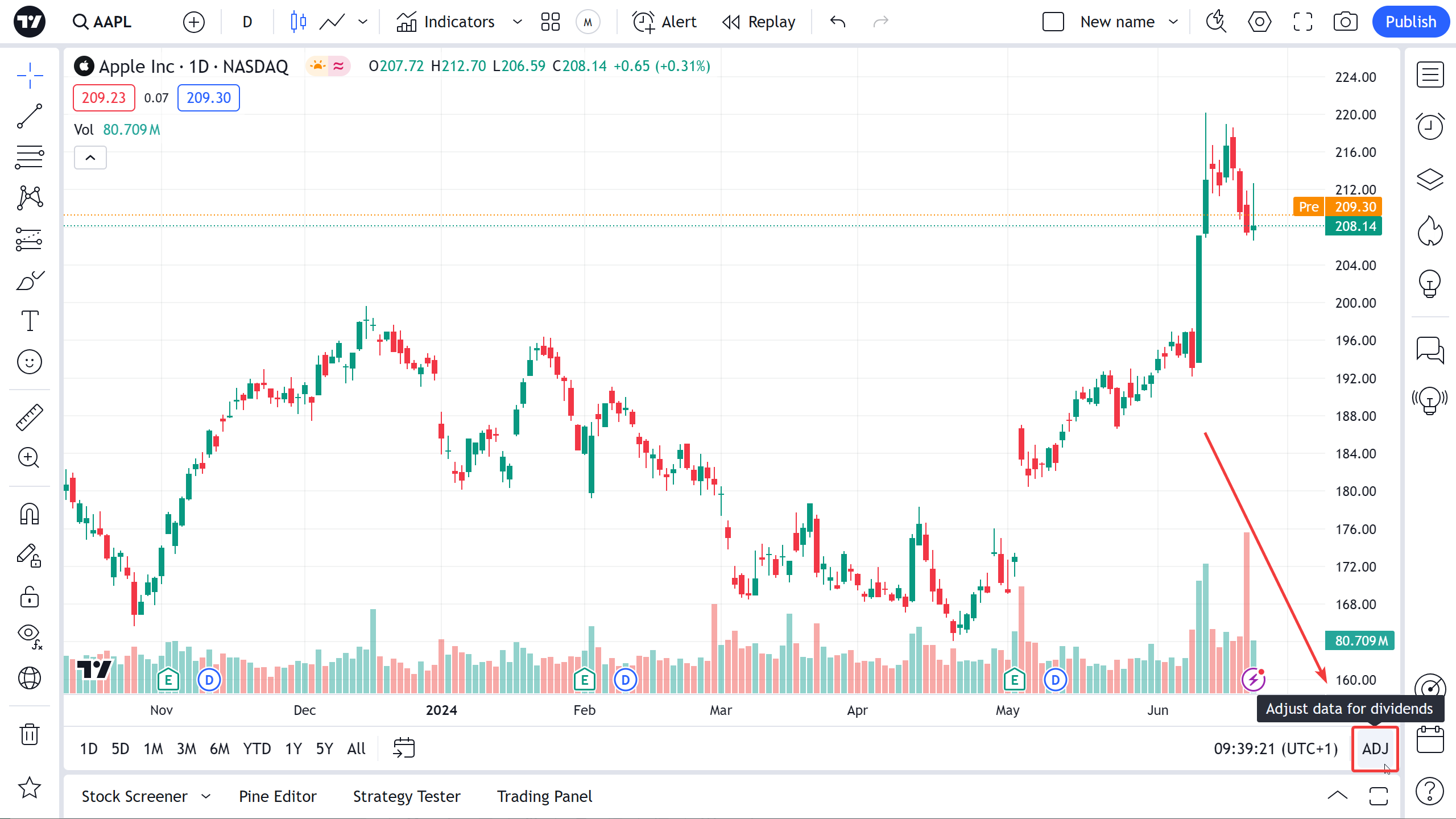 配当金の調整を有効にするには、スーパーチャートの設定に移動して「配当でデータを調整」のチェックボックスをオンにします。