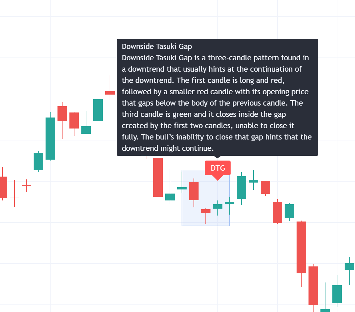 下放れタスキは、下降トレンド中に見られる3本のローソク足パターンです。通常は、下降トレンドの継続を示します。最初に赤の長いローソク足が出現し、次に赤の短いローソク足が続きますが、その始値は最初のローソク足実体より下になります。3本目のローソク足は緑色で、最初の2本のローソク足によって作られたギャップの内側で引けており、ギャップを完全に埋めることができません。買い手がギャップを埋められなかったことにより、このパターンは下降トレンドの継続を示唆しています。