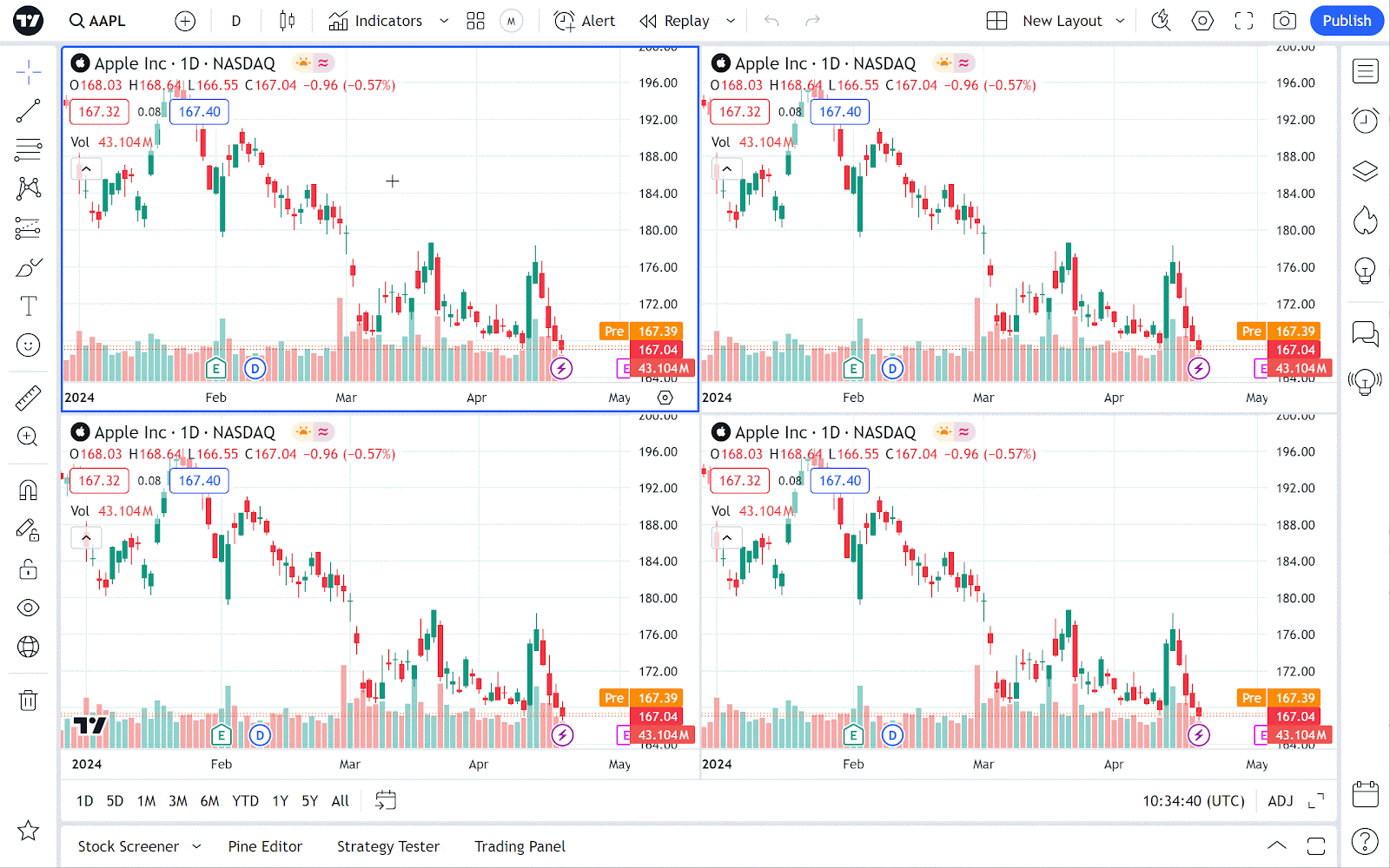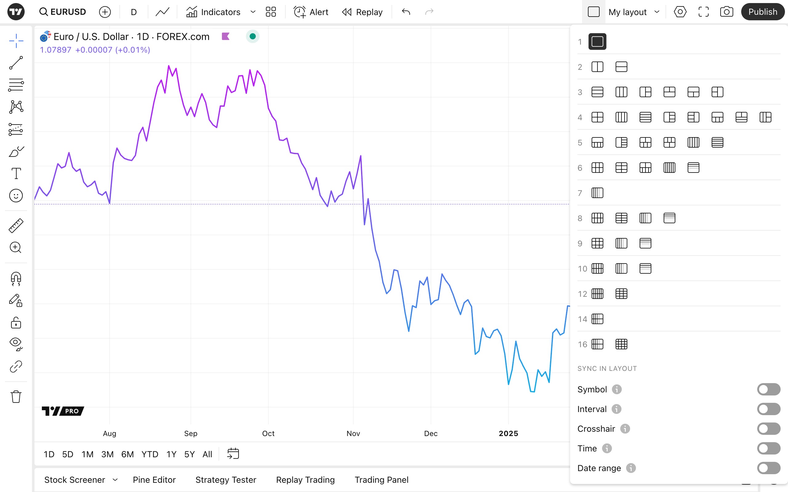 マルチチャートを選択した場合、最初に表示されていたチャートのインジケーターとストラテジーはここで追加されたチャートすべてに適用されます。チャート設定については設定を行ったチャート自体に紐づいているため、追加されたチャートには引き継がれないことに注意してください。しかし、時間足やシンボルなどの基本的な設定については、レイアウト設定メニューで同期させることができます。
