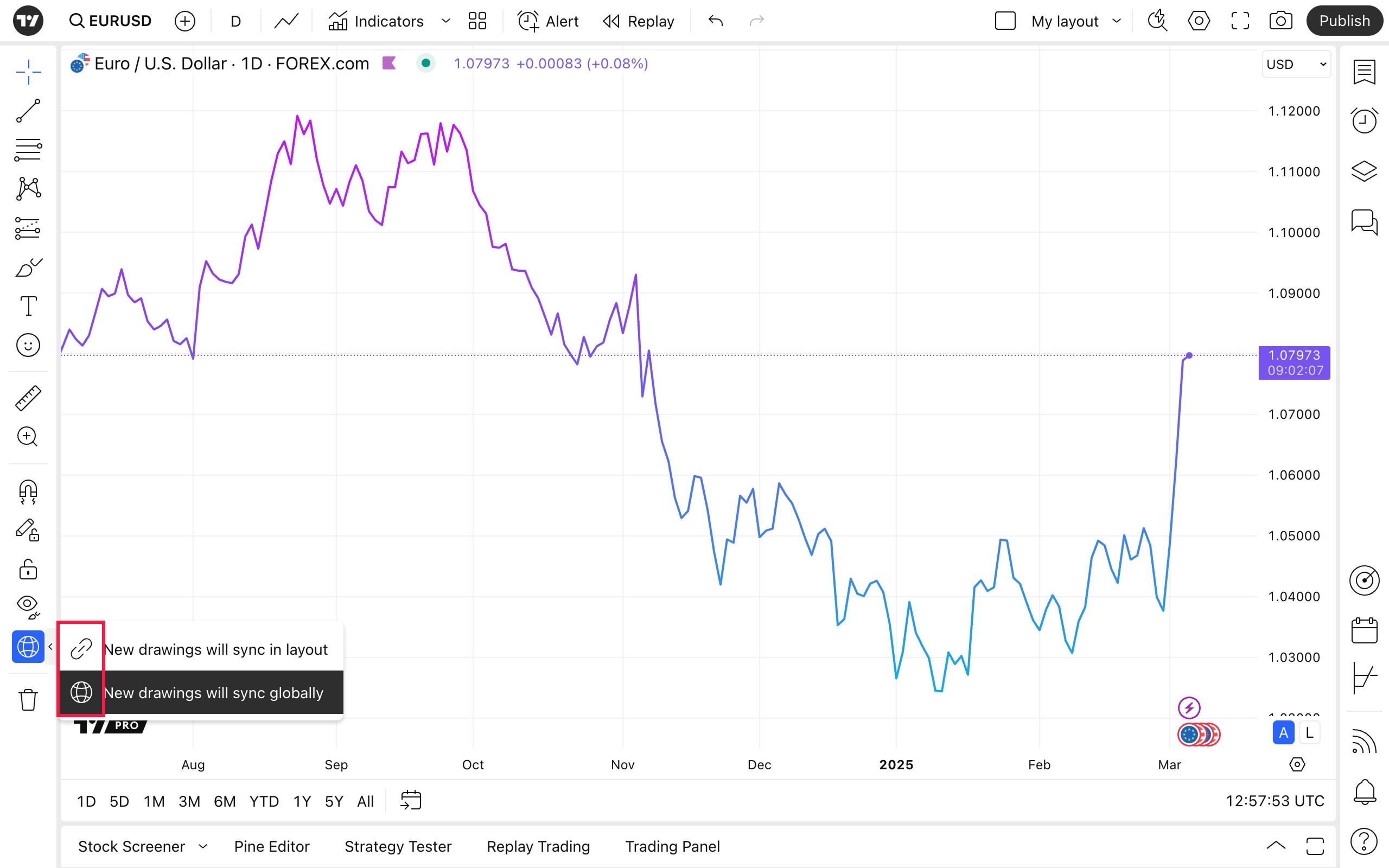 • 「グローバルに同期」を選択すると、新規レイアウトを作成した場合も含め、常に同じシンボルのチャートすべてに描画が保存されます