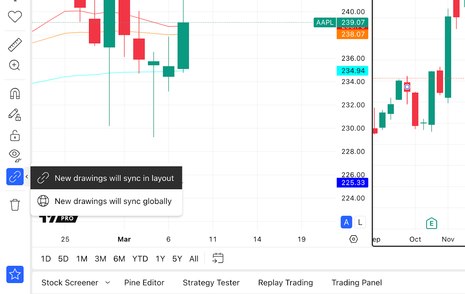 同期が無効の場合、描画オブジェクトはそのレイアウト内の特定のチャートにのみ保存されます。「レイアウト内で同期」されている場合、特定のシンボルチャートに追加した描画は、そのレイアウト内のすべてのチャートに同期されます。描画の同期を無効にすると、その描画は他のすべてのチャートから削除されます。