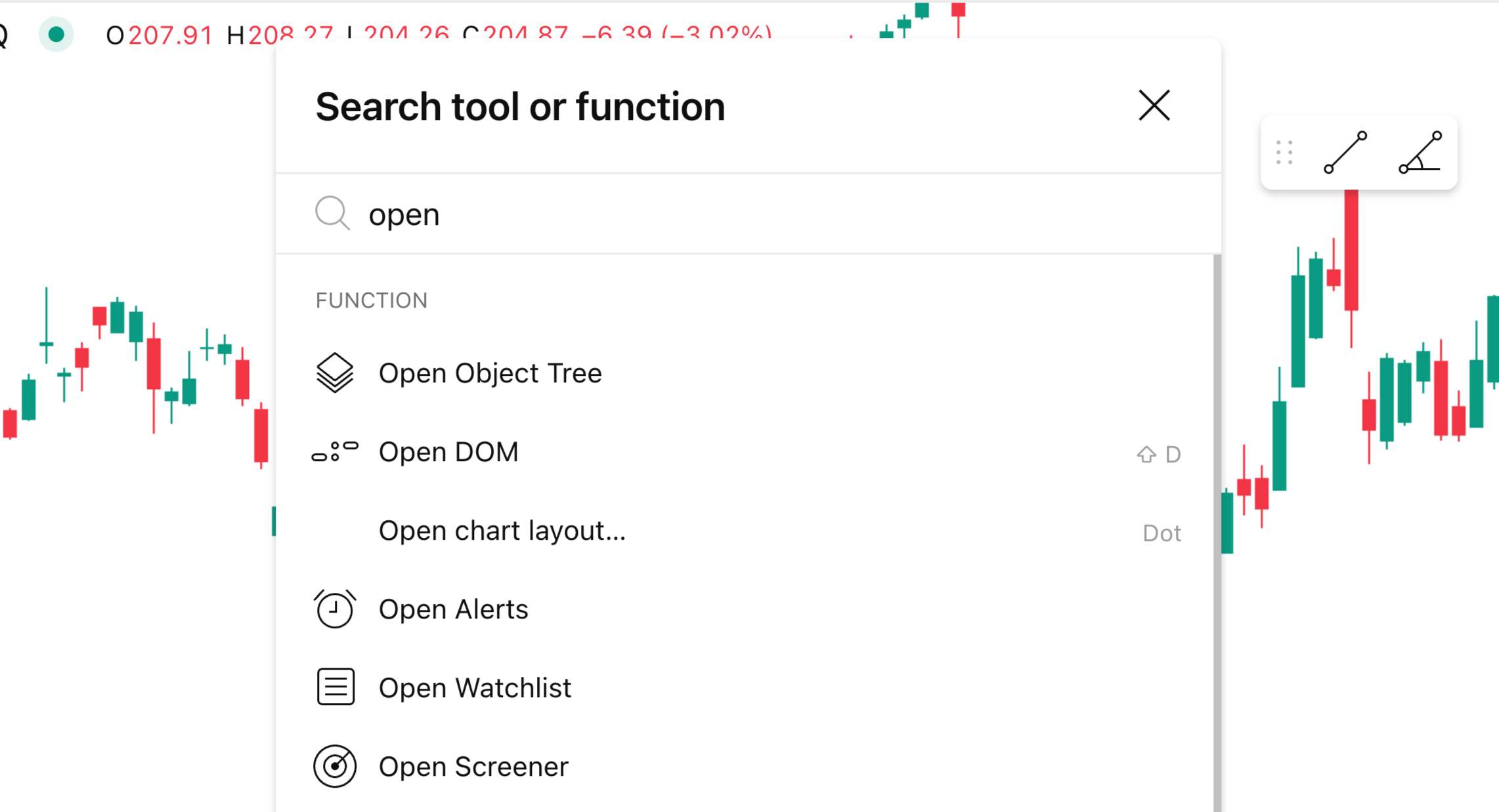 「クイックサーチ」はチャートをシンプルかつ効率的に操作する方法です。チャート設定や描画ツールの新規追加など、すばやく何かを見つけたいときにこの機能を使うと、様々なメニューを探しまわることなく分析に集中することができます。