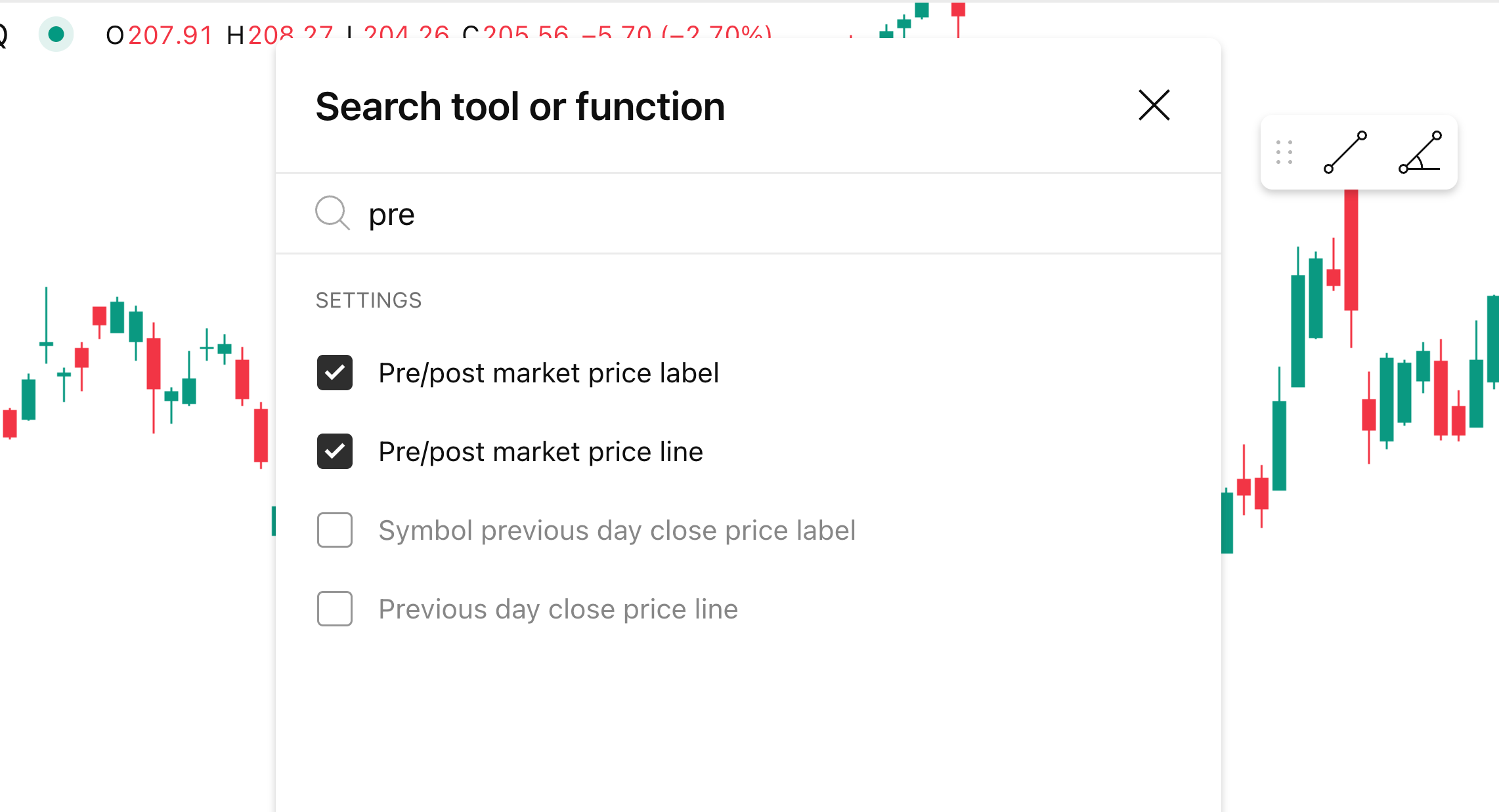 もしスーパーチャートを使い始めて間もない方であれば、そのボリュームに圧倒されることもあるでしょう。そこで、時間を節約して効率的に分析を進めることができるよう「クイックサーチ」をご用意しています。この機能を使うと、ワークスペースを離れずにツール/コマンド/設定などを検索して、すばやくそれらを利用できるようになります。