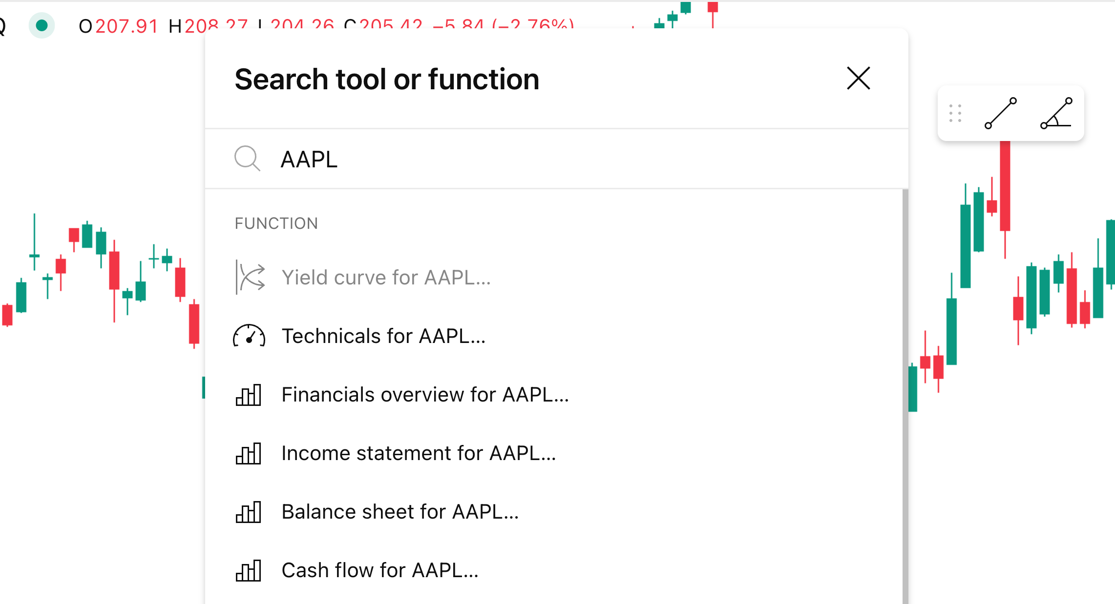 また、チャート上に表示しているシンボルについて、関連する指標やデータを検索することもできます。ティッカー名を入力すれば、分析に利用できるデータのリストが表示されます。