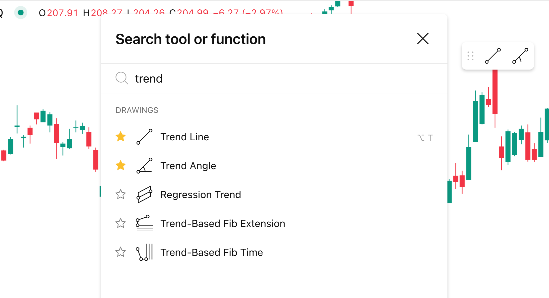 - 描画:トレンドライン、フィボナッチ・リトレースメント、長方形を追加したい場合は? ― ツール名を入力するだけです。ツール名がポップアップ表示されるので、そこから即座に選択することができます。また、お気に入りに追加すると次回以降すばやくアクセスできます。