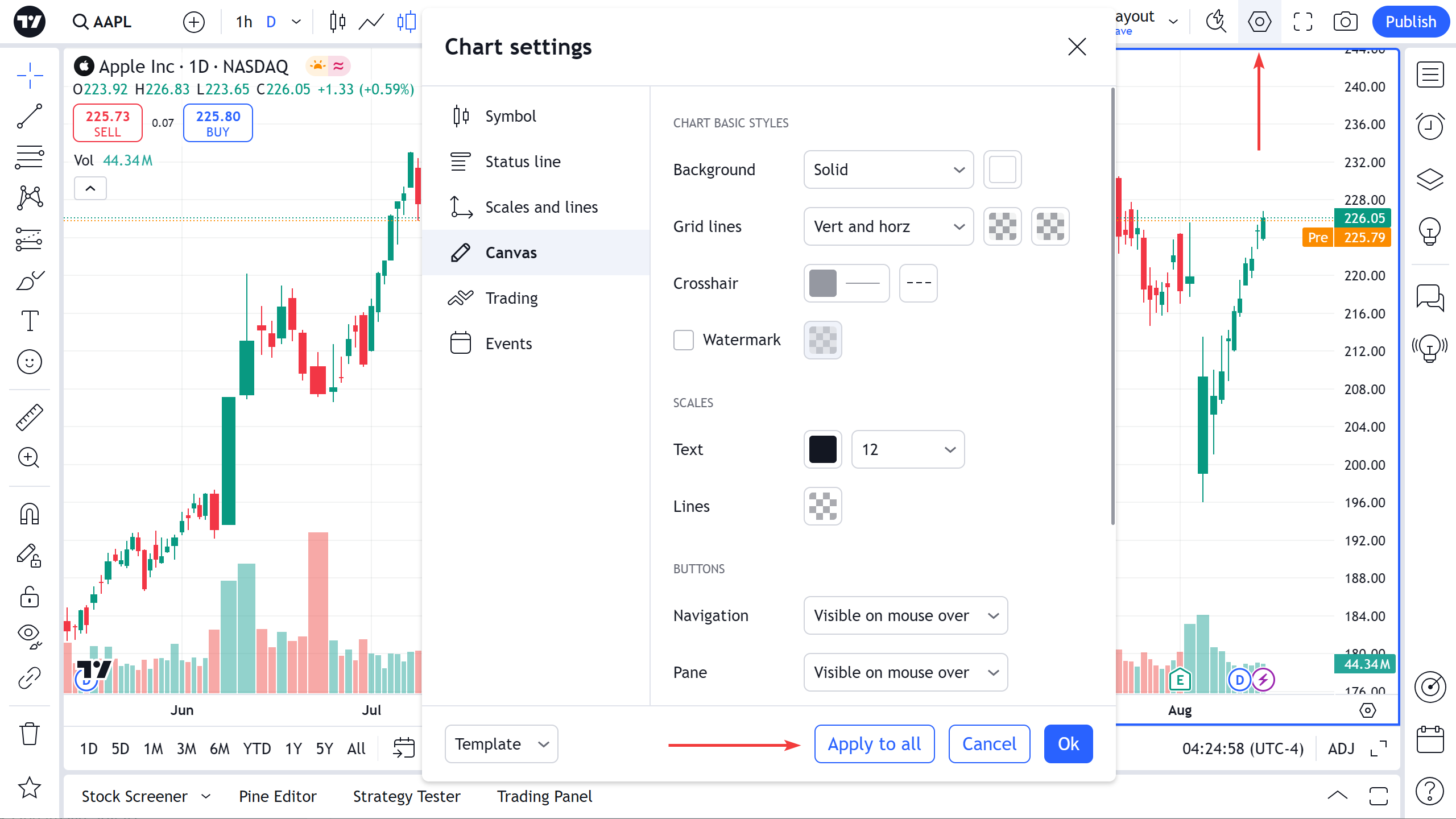 (レイアウト内の)すべてのチャートに対して、個別に手動で同じ設定を行う必要はありません。チャート設定にある「すべてに適用」ボタンをクリックして同じ設定を適用することができます: