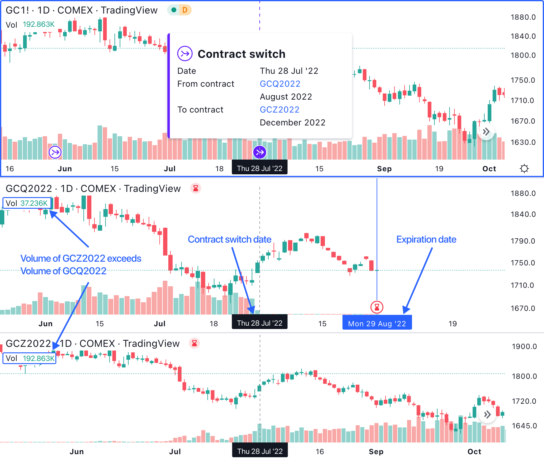 しかし、12月限のGCZ2022への切り替え日はもっと早く、8月限の出来高が、つなぎ足の切り替え先である12月限の出来高より少なくなった時の2022年7月28日になります。
