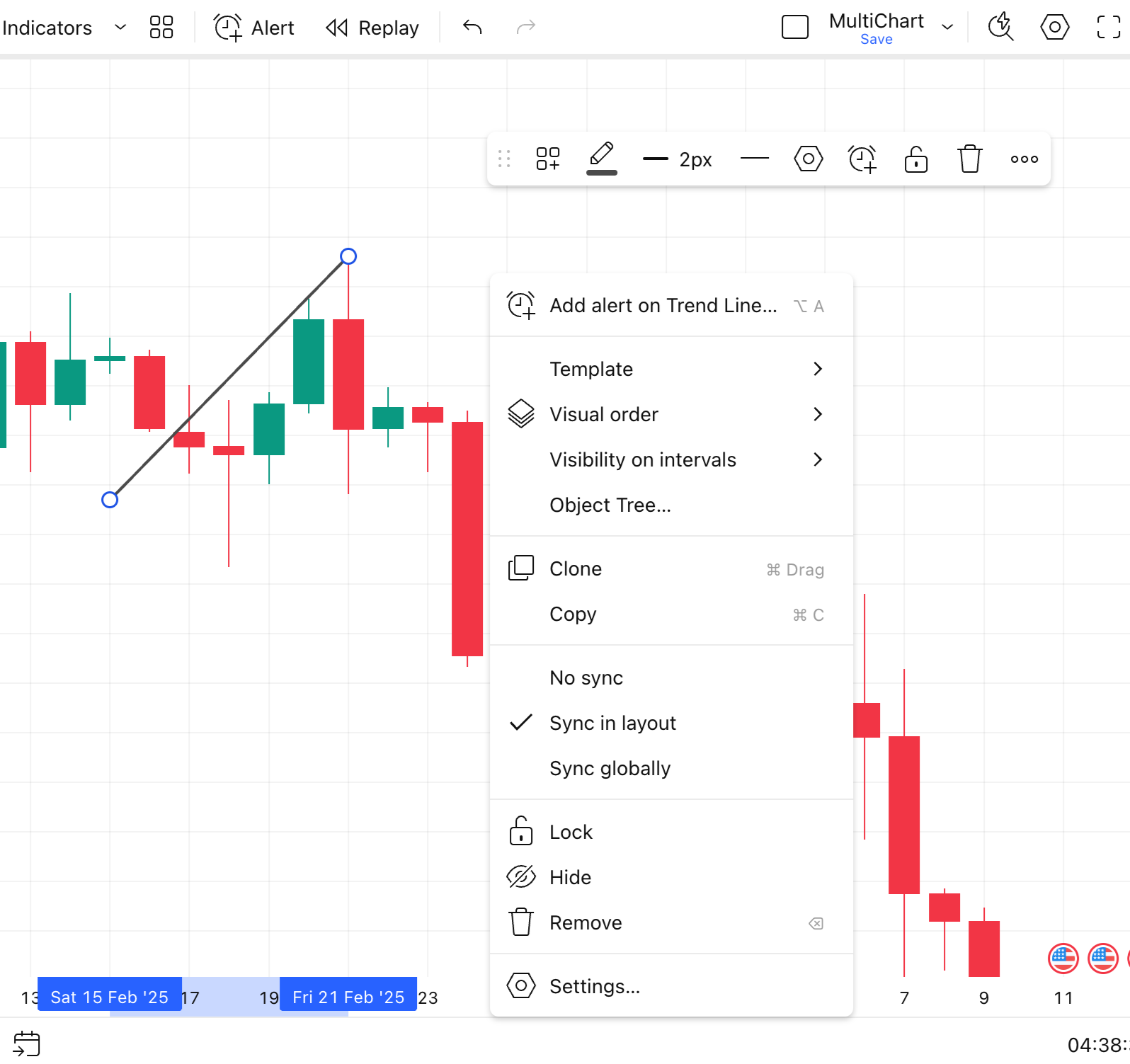 「グローバルに同期」を選択した場合、描画オブジェクトはすべてのチャートとレイアウトで同期され、新規に作成したレイアウト内でも表示されます。描画オブジェクトのグローバル同期モードをオフにすると、他のすべてのレイアウトからそのオブジェクトが削除されます。