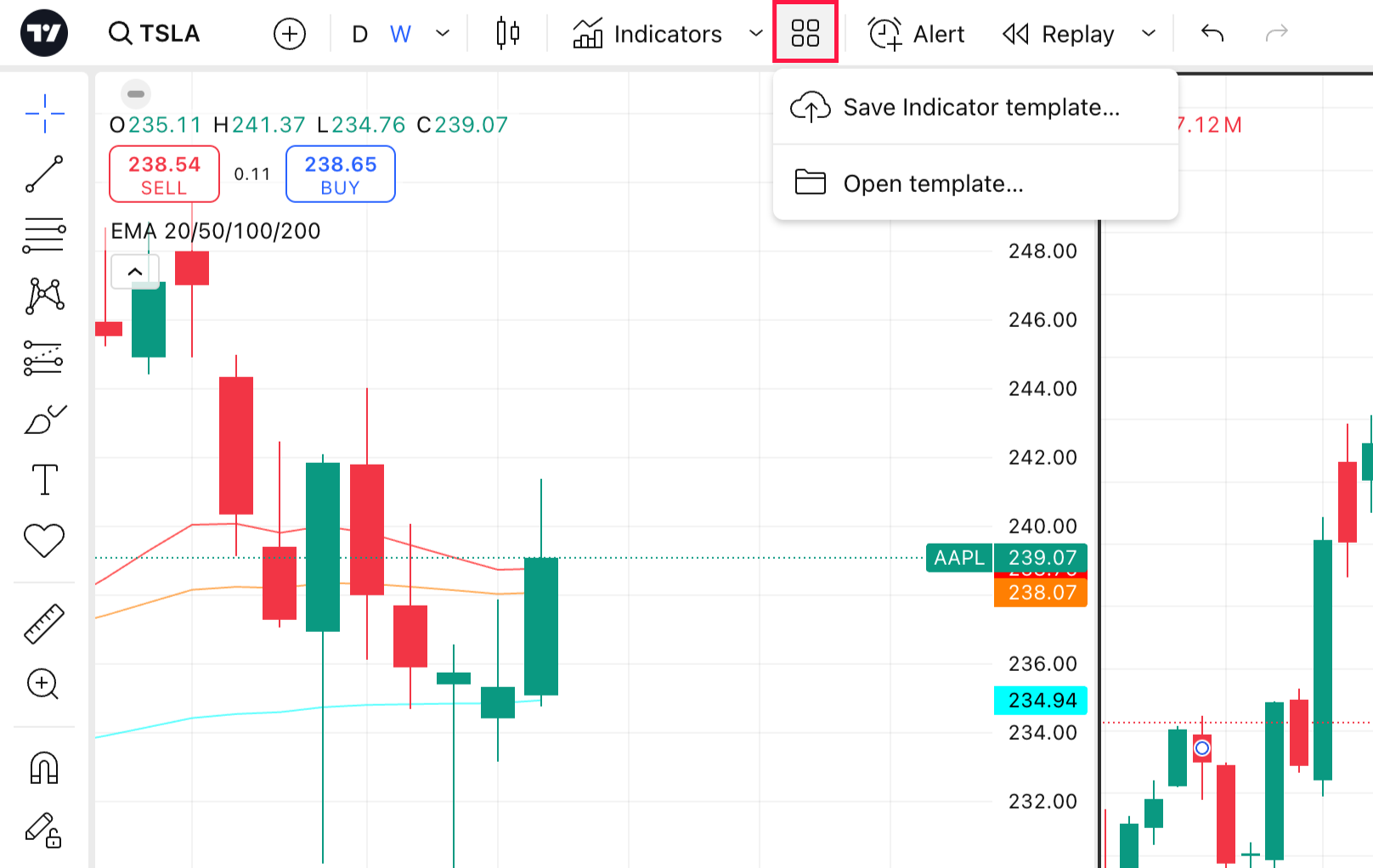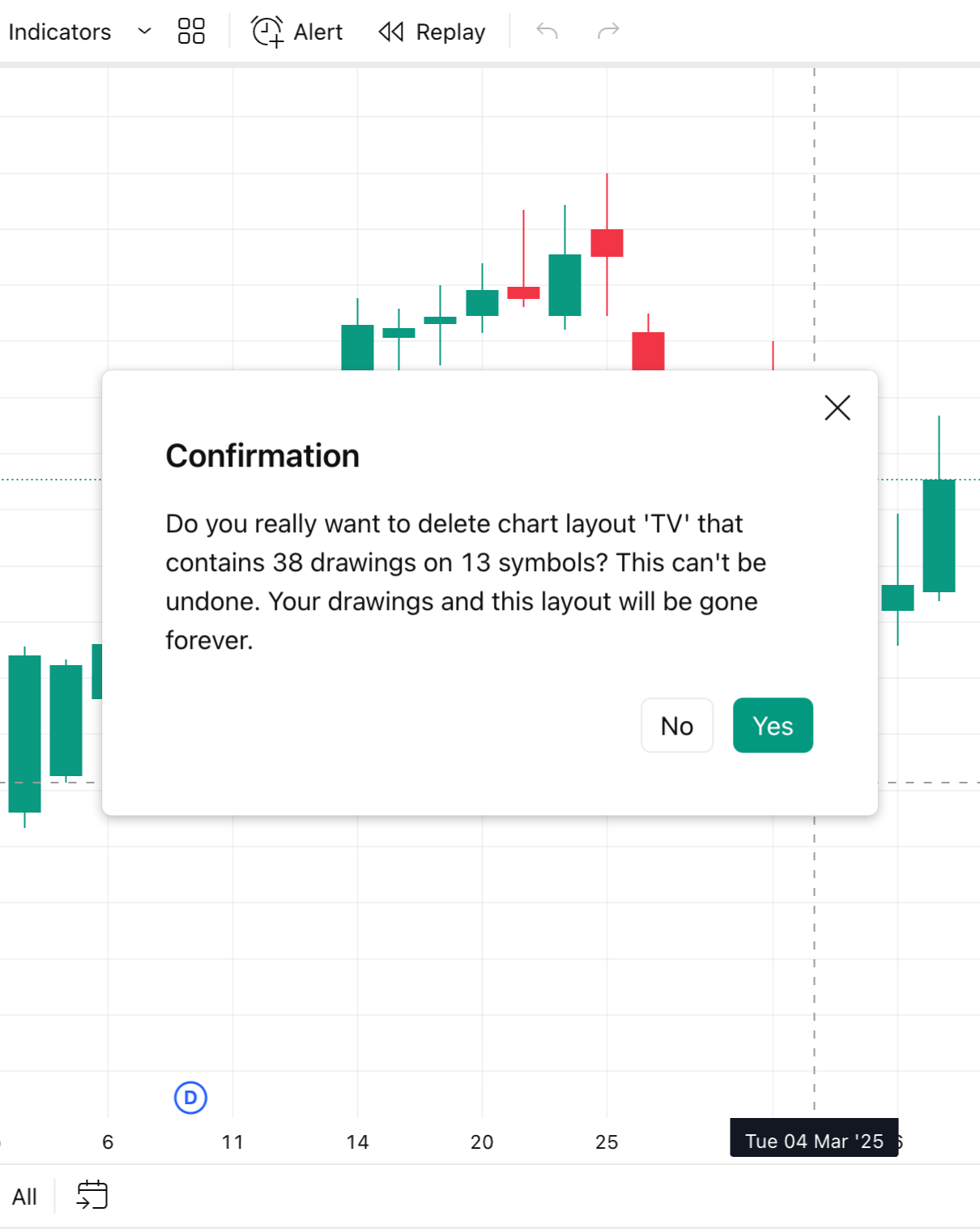 誤ってインジケーターテンプレートを適用して、インジケーターを含む画面から描画オブジェクトを削除してしまった場合は、すぐに「キャンセル」をクリックしてください。そうしないと、描画オブジェクトを元に戻すことはできません。