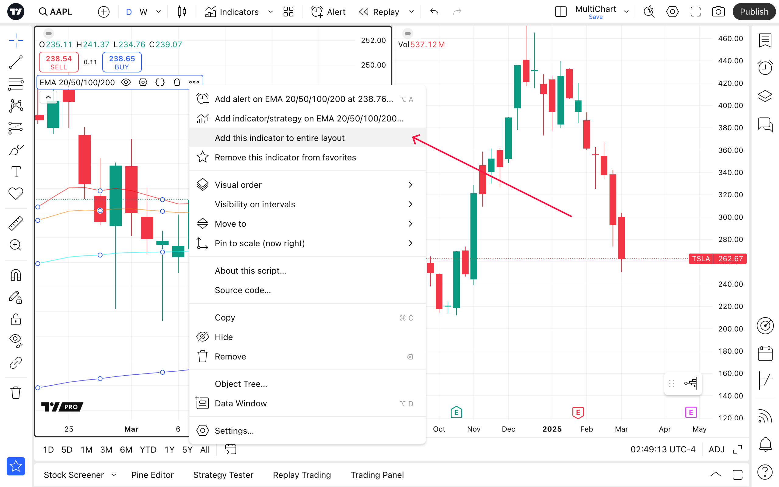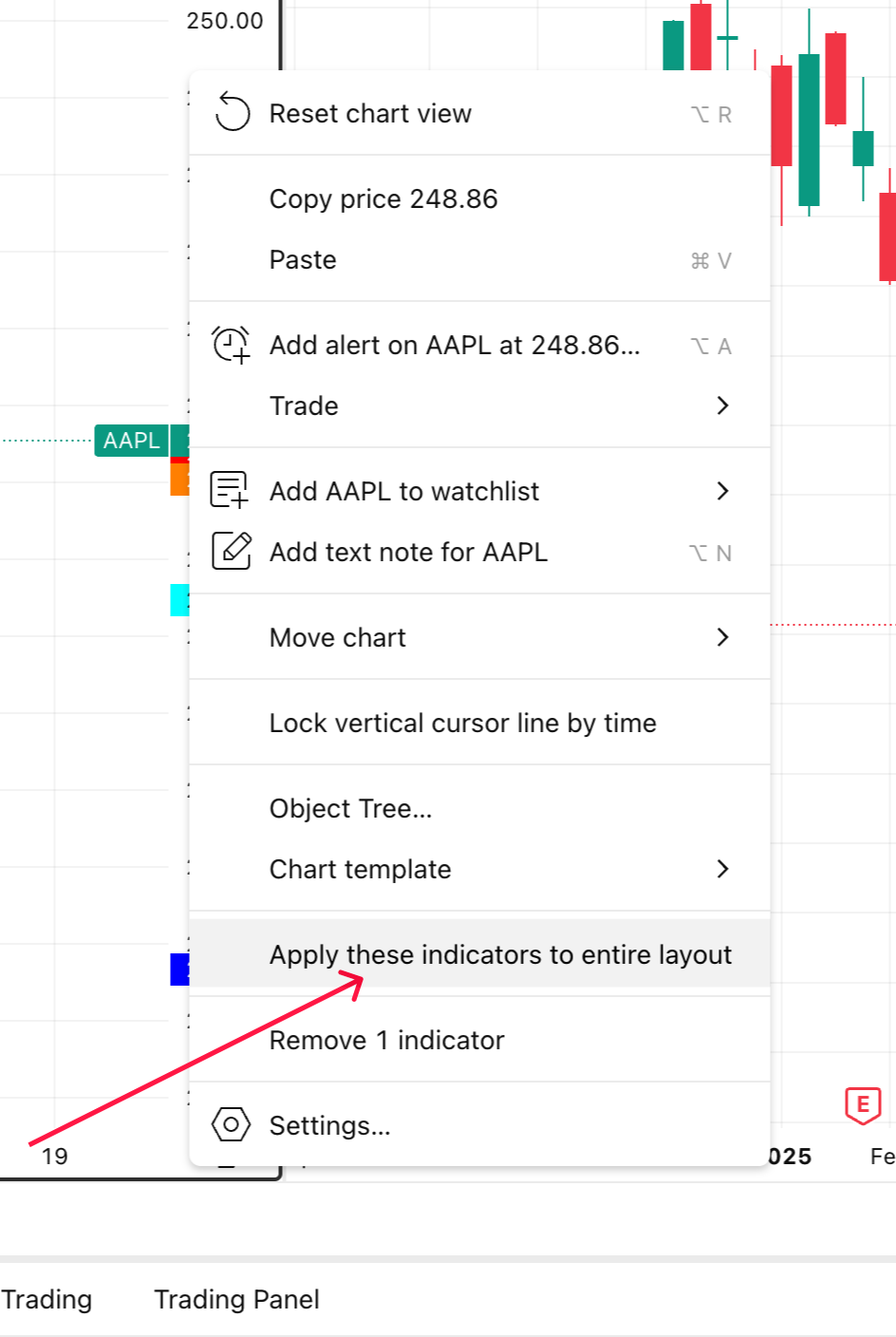 または、チャートのコンテキストメニューから「これらのインジケーターをレイアウト全体に適用」をクリックすることで、現在のチャート上に存在するすべてのインジケーターを他のチャートすべてに適用することができます。