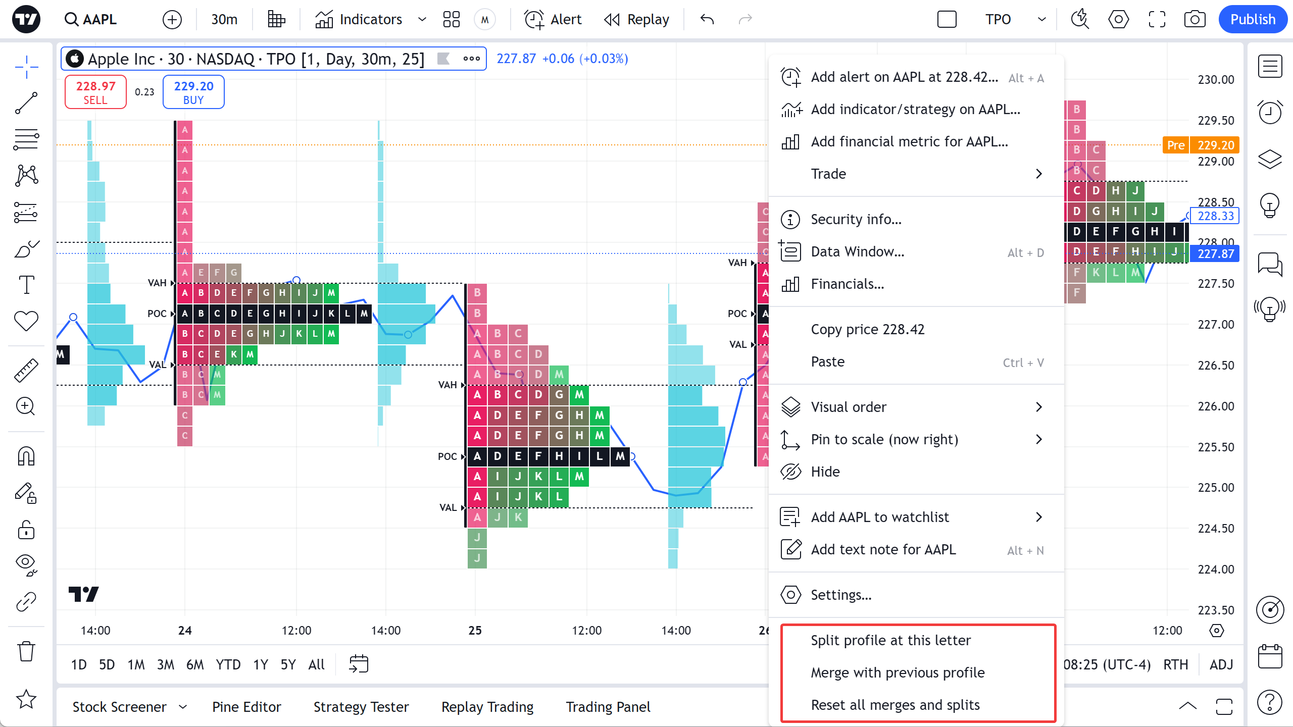 タイム・プライス・オポチュニティ (TPO) チャートタイプは「マーケットプロファイル」とも呼ばれ、プロファイル期間中の価格動向や、ある期間中にある特定の水準へと価格が集中していることが視覚化できます。スーパーチャートでTPOを使うと様々な価格水準のなかでも最も動きが活発な水準と最も動きが鈍い水準を判断できるので、今後の価格動向を評価するヒントが得られます。