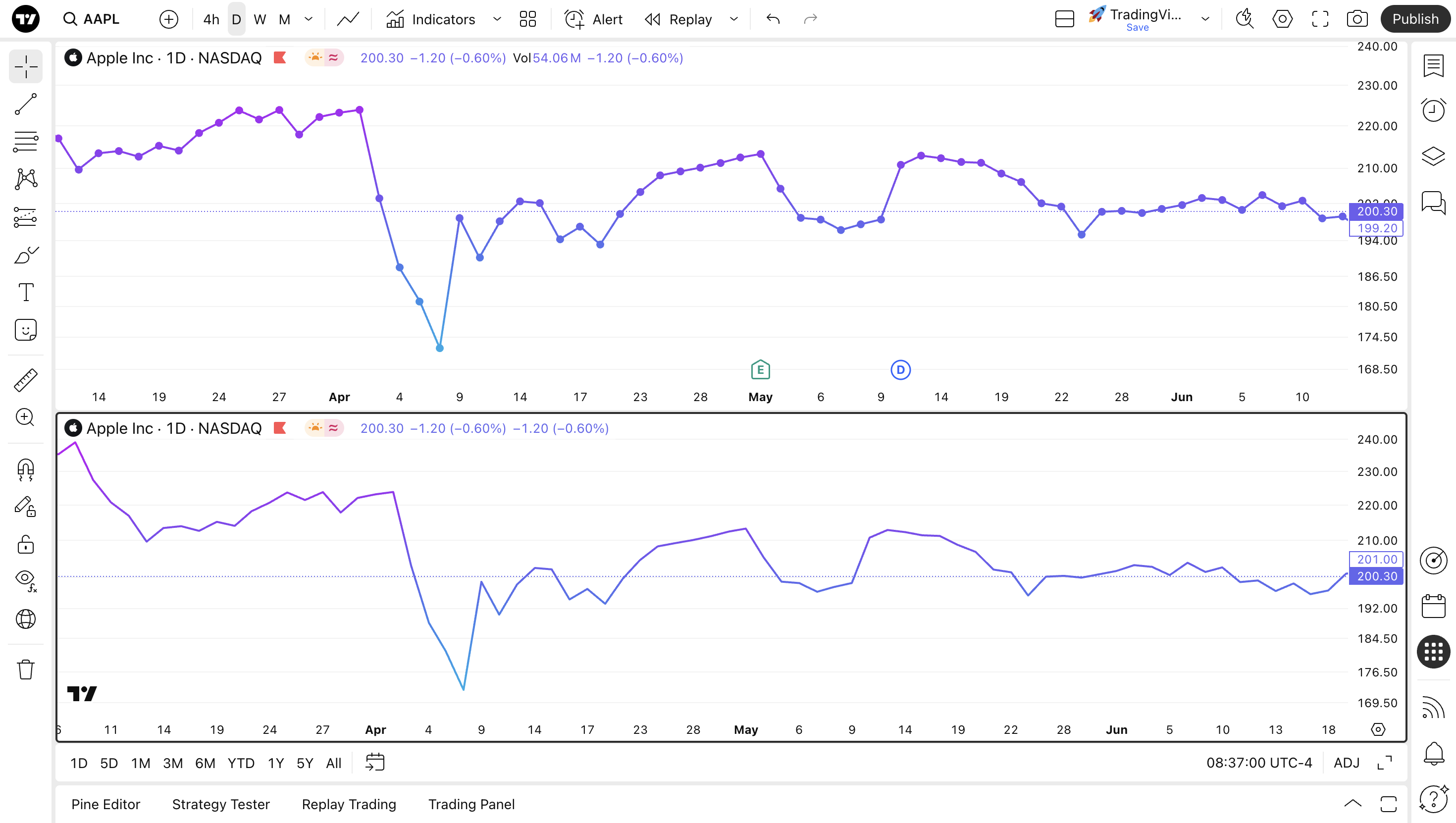 この2つのチャートタイプは「同じでただマーカーが付いている」という点だけが相違しているように見えますが、この小さなちがいがチャートとデータポイントの見方を大きく変えることがあります。スーパーチャートでは資産の価格だけでなく、たとえば、金利・インフレ率・債券の利回りなどを見ることができるので、場合によってはマーカーがこれらの値をピンポイントで示すのに非常に役立つ場合があります。