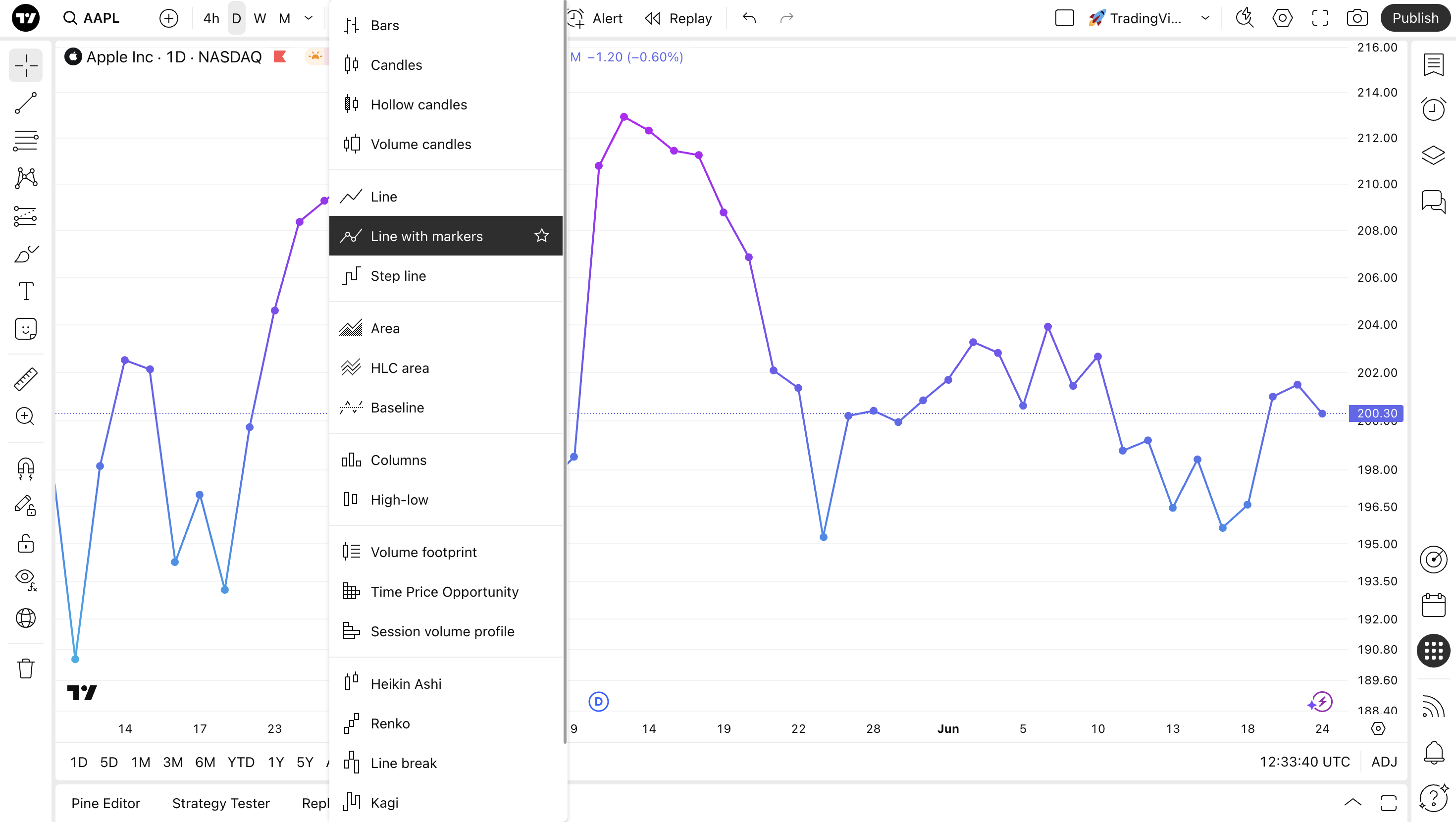 マーカー付きラインチャートはラインチャートの一種ですが、オリジナルのラインチャートとは異なり、マーカー付き折れ線グラフには、ライン上の各データポイントに明確な点(マーカー)が付けられています。これは資産の価格変動を時間とともに追跡するのに一般的に使用され、特定のデータポイントを強調表示することで視認性を高めています。スーパーチャートで、描画、インジケーター、その他の市場分析ツールと組み合わせて使用できます。