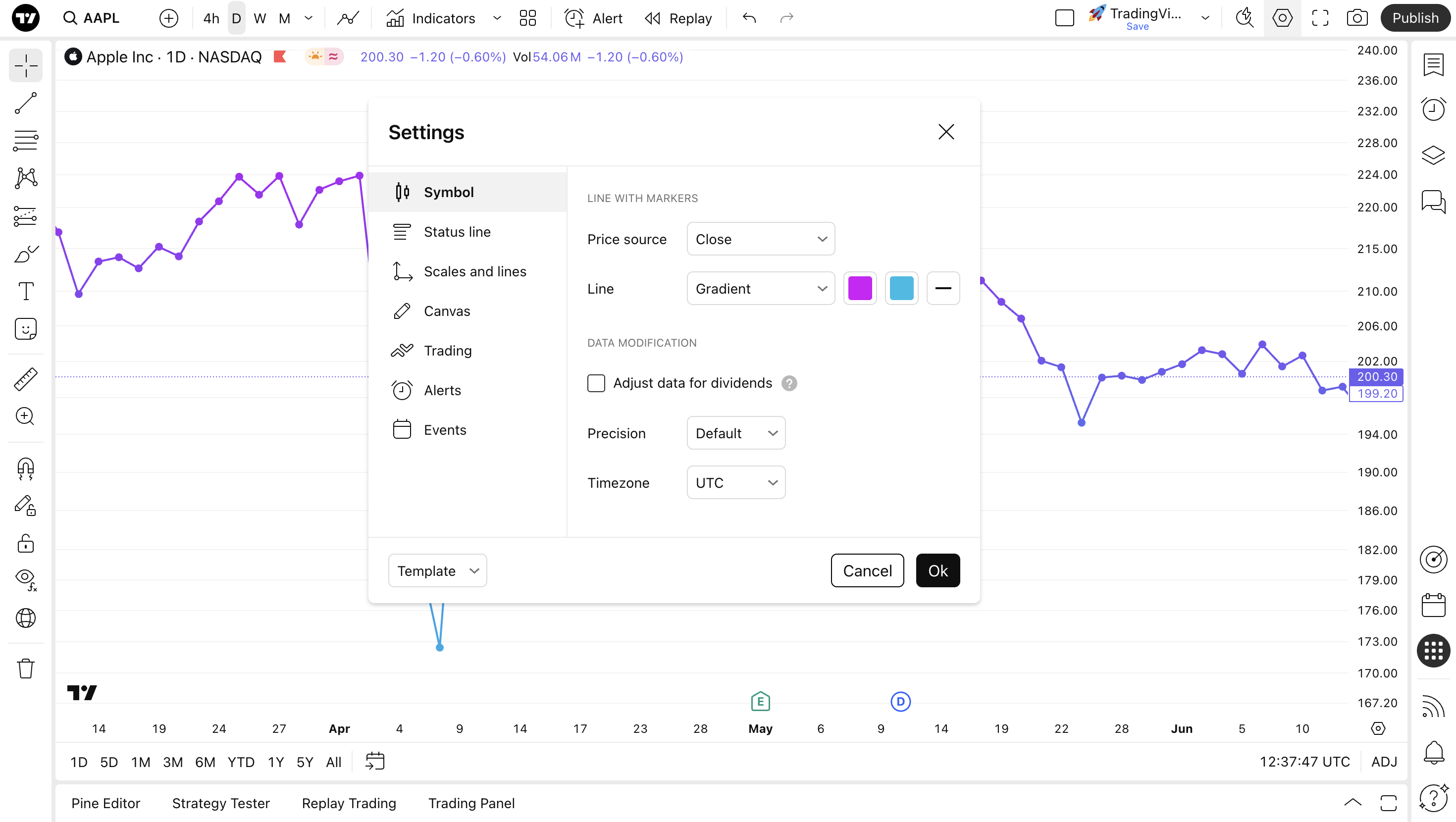 マーカー付きラインチャートの設定を調整するには、画面上部のツールバーから「設定」を選択して「シンボル」タブに移動します。