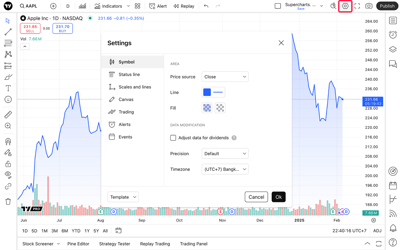 設定を行うには、画面上部のツールバーから歯車アイコンの「設定」を選んで、「シンボル」タブを選択します。