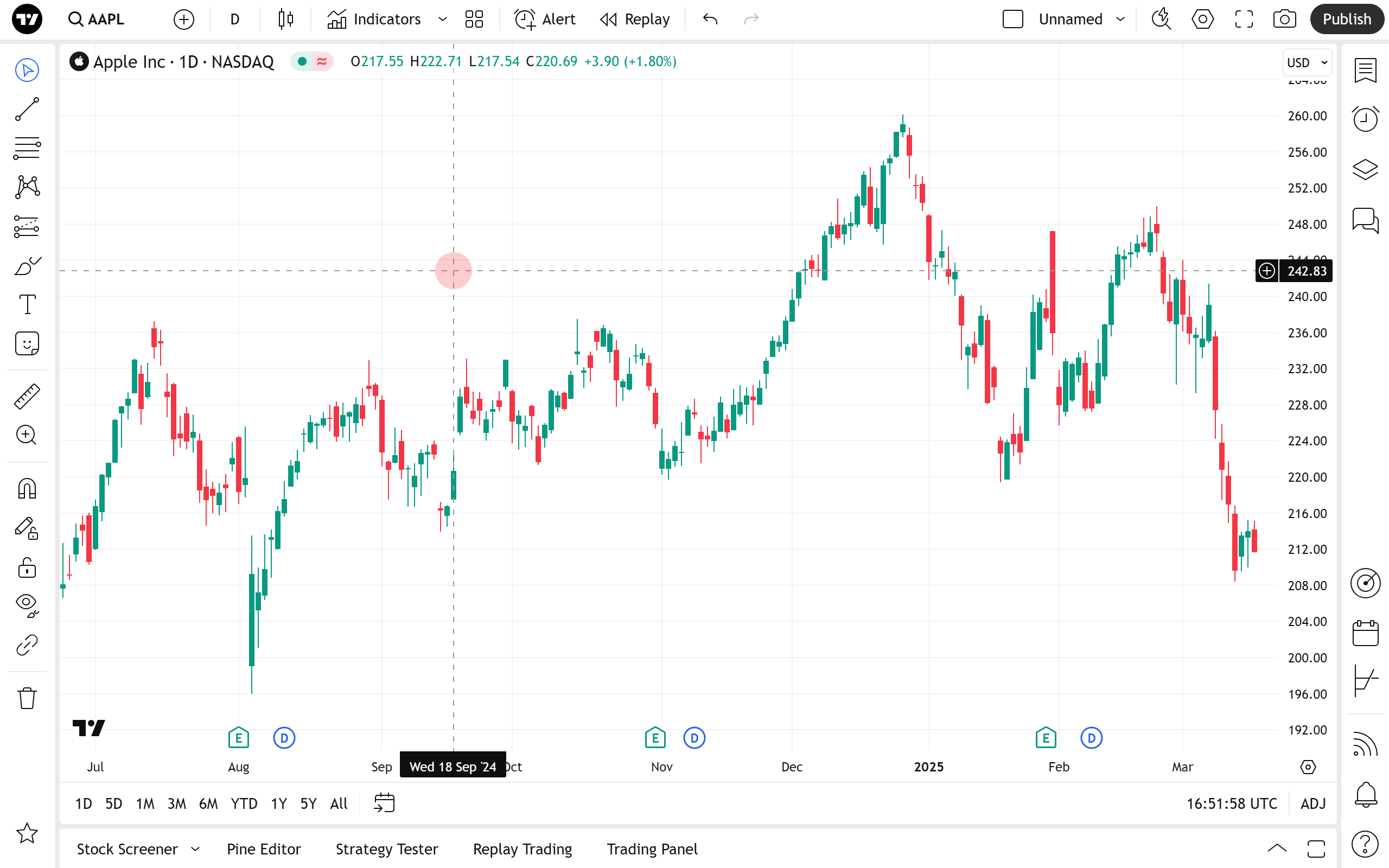 「レーザーポインター」カーソルは「マーカー」ツールと似ています。チャートに何かを描いたり目印をつけたりすることもできますが、時間が経つとしだいに消えていく仕組みになっています。ライブ配信でのデモンストレーションや動画アイデアの録画の際に便利なツールです。一時的な描画なので強調したい場所を指し示したあとでも消す手間が省け、チャートの重要部分に視聴者の注意を引くことができます。