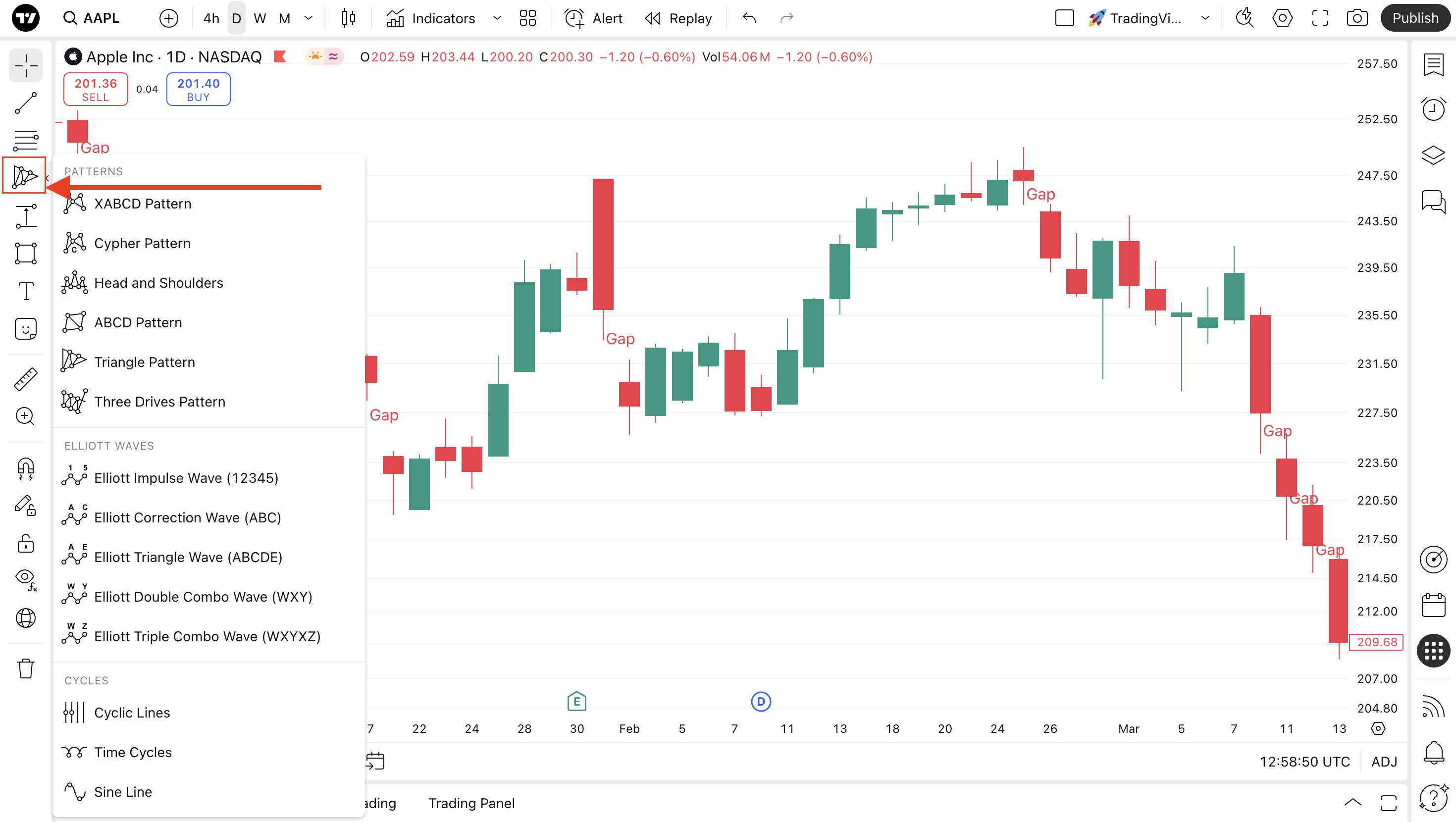 画面上部のツールバーにある「インジケーター」のドロップダウンメニューからアクセスできます。「テクニカル」タブに移動して「パターン」をクリックしてください。