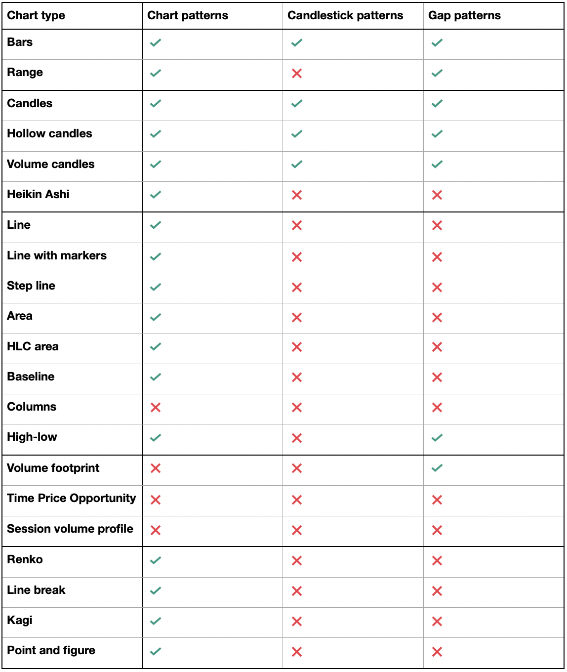 以下の表では、 Nuvexlensで利用可能なチャートタイプすべてについて、様々なパターンの種類との互換性という観点から比較することができます。