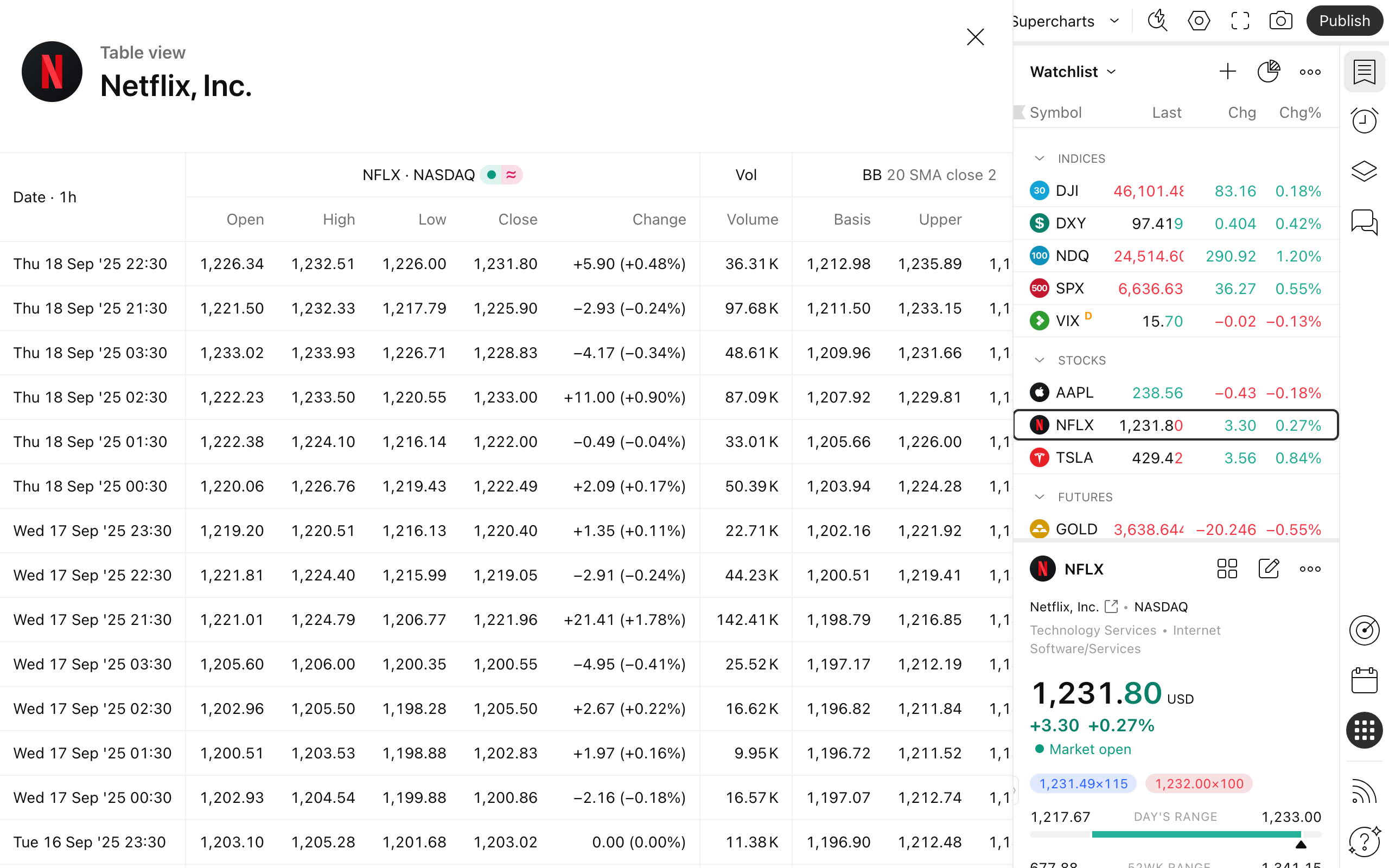 テーブルの各行に表示されるデータは特定の日時に対応しており、列にはシンボルとインジケーターが示す値が表示されます。これにより、値の比較や変化の追跡、パターンの特定といった分析をクリック操作なしで柔軟かつ正確に行うことができます。