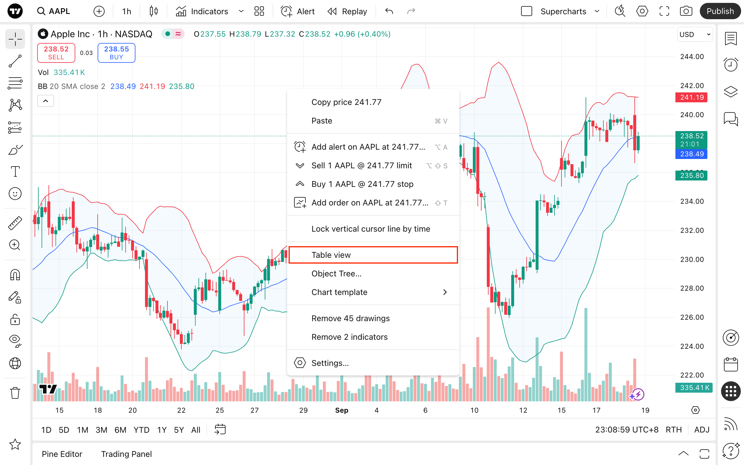 「テーブルビュー」に切り替えるには、チャートの背景を右クリックすると表示されるコンテキストメニューから「テーブルビュー」を選択します。