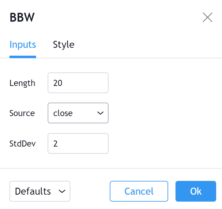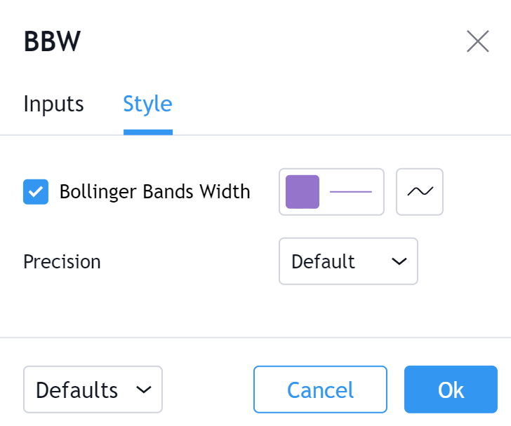 ボリンジャーバンド幅の値を表示するラインの可視性を切り換える事ができます。ボリンジャーバンド幅のラインの色や太さ、ビジュアルタイプ(デフォルトはラインです)を選択する事も可能です。