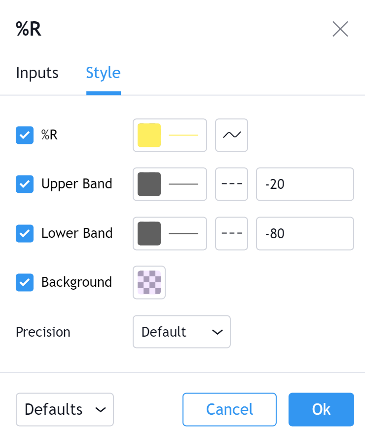 前述のように、%Rはモメンタムの測定に使用され、0から-100の値の固定範囲内で振動します。ウィリアムズ自身が設定した買われすぎのパラメーターは0から-20で、売られすぎのパラメーターは-80から-100の値でした。これらの値はあくまでも伝統的な例である事を覚えておく事が重要です。テクニカルアナリストは、分析対象の銘柄により異なるパラメータを設定することが有益な場合があります。また過去の分析に基づいて、買われすぎや売られすぎの適切なレベルは、より広くなる/より狭くなる場合があります。