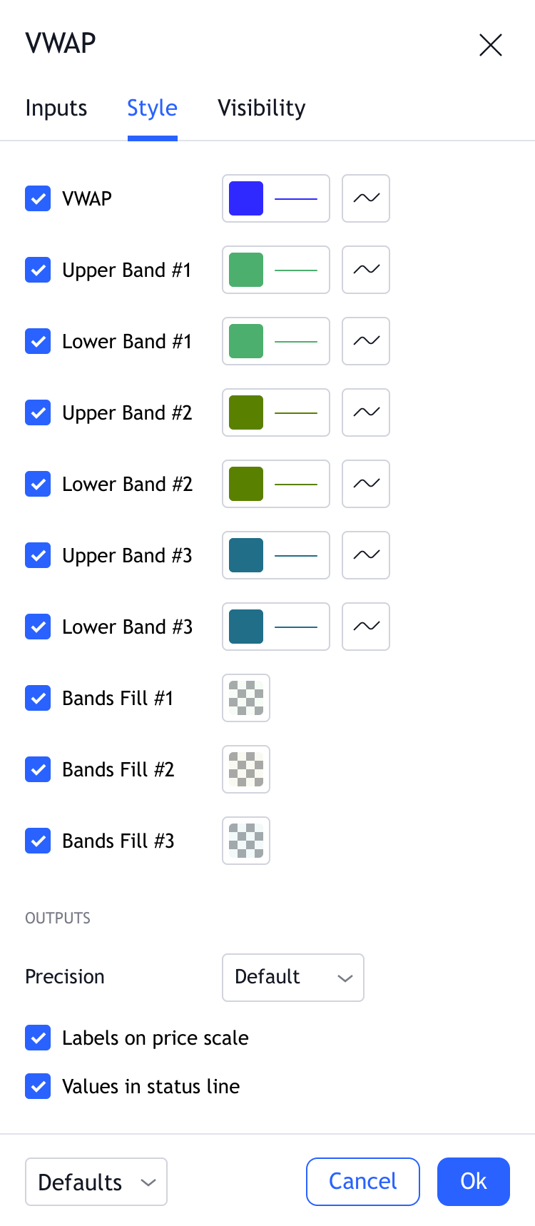 VWAP標準偏差の可視性の切替、およびその色とラインのタイプの設定が可能です。